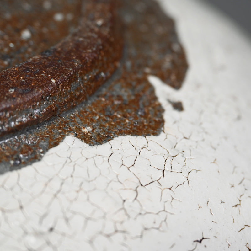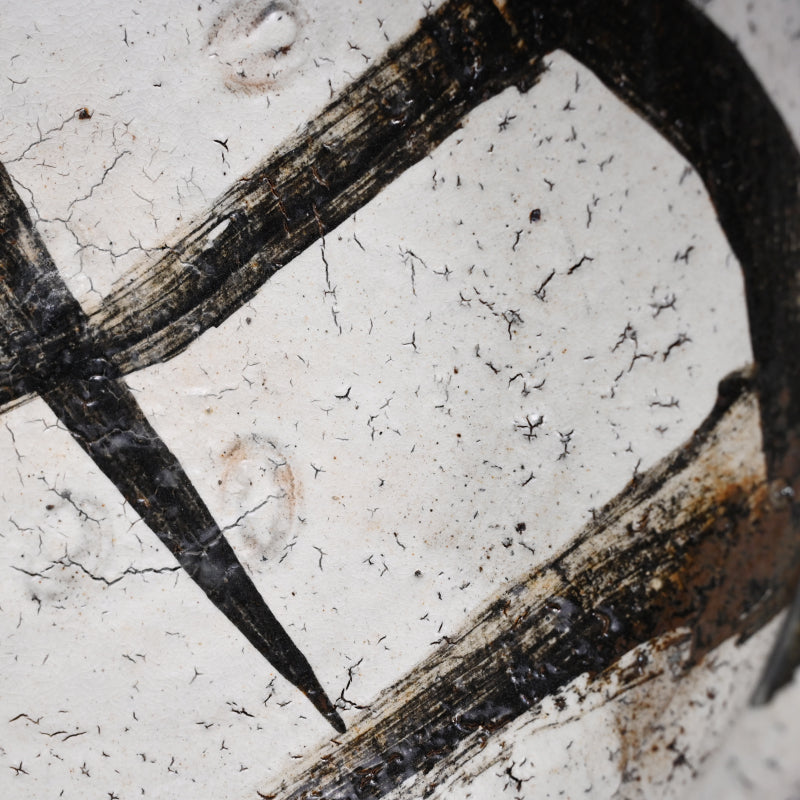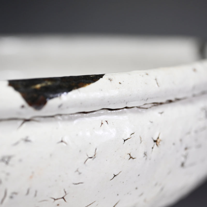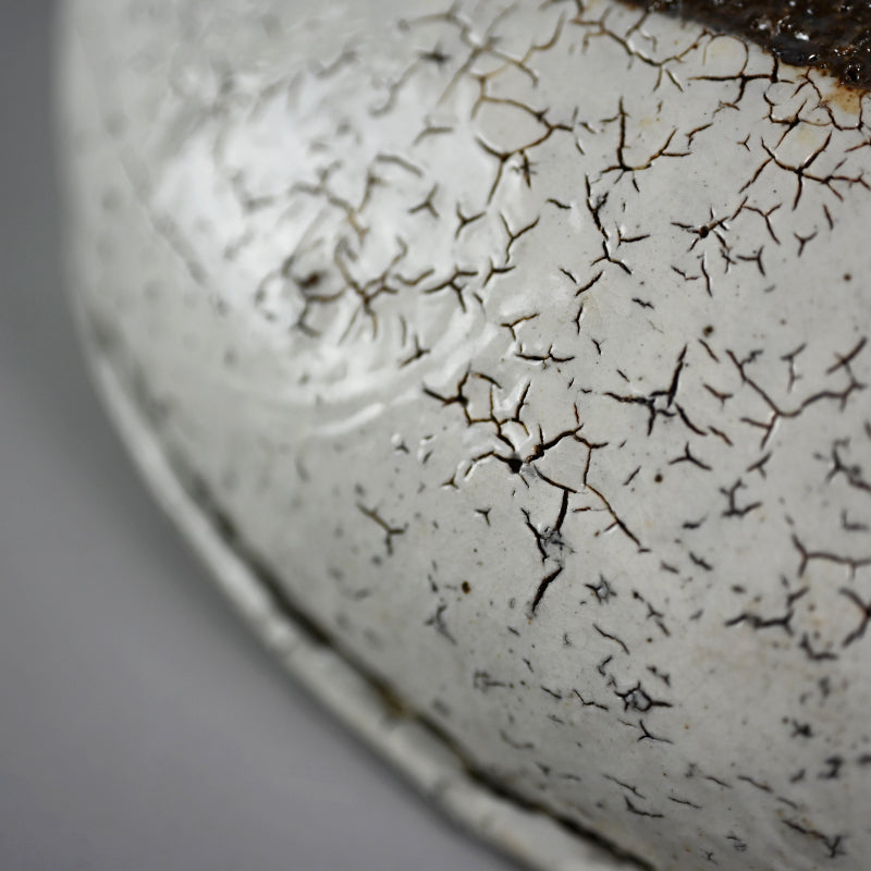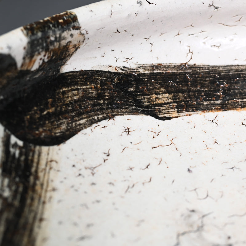 Strikes of an iron loaded brush cross the organic white surface of this large basin by Nakagawa Jinenbo enclosed in the original signed wooden box titled E-Kohiki Karatsu Hachi. It is 34.5 cm (13-3/4 inches) diameter 10.5 cm (4 inches) tall and in excellent condition.