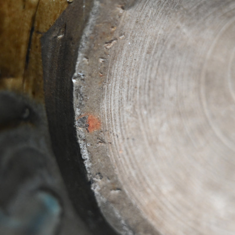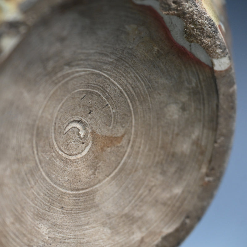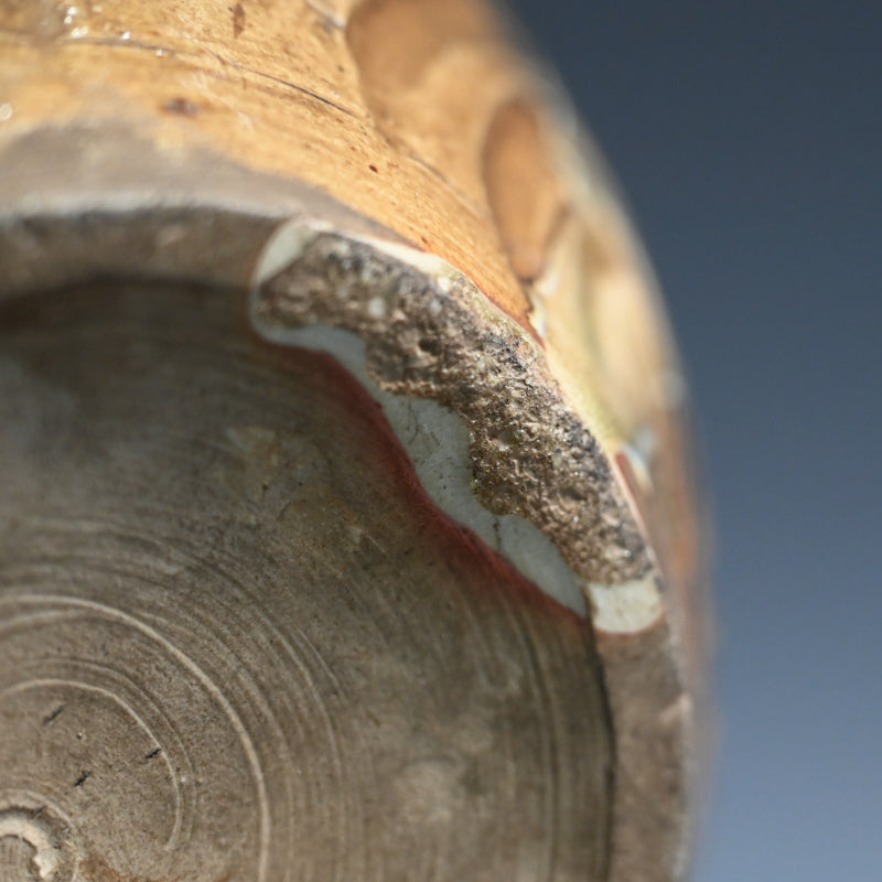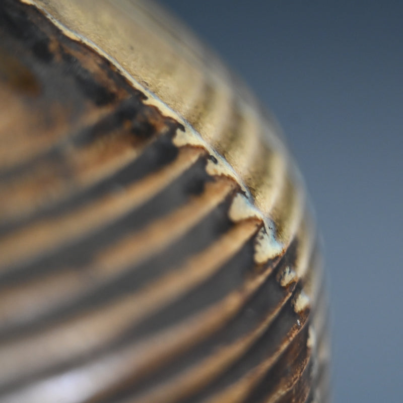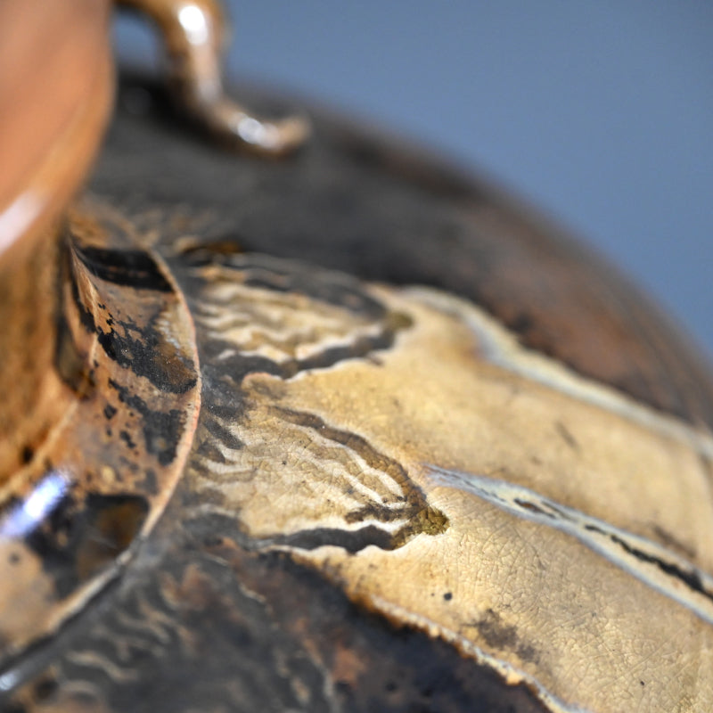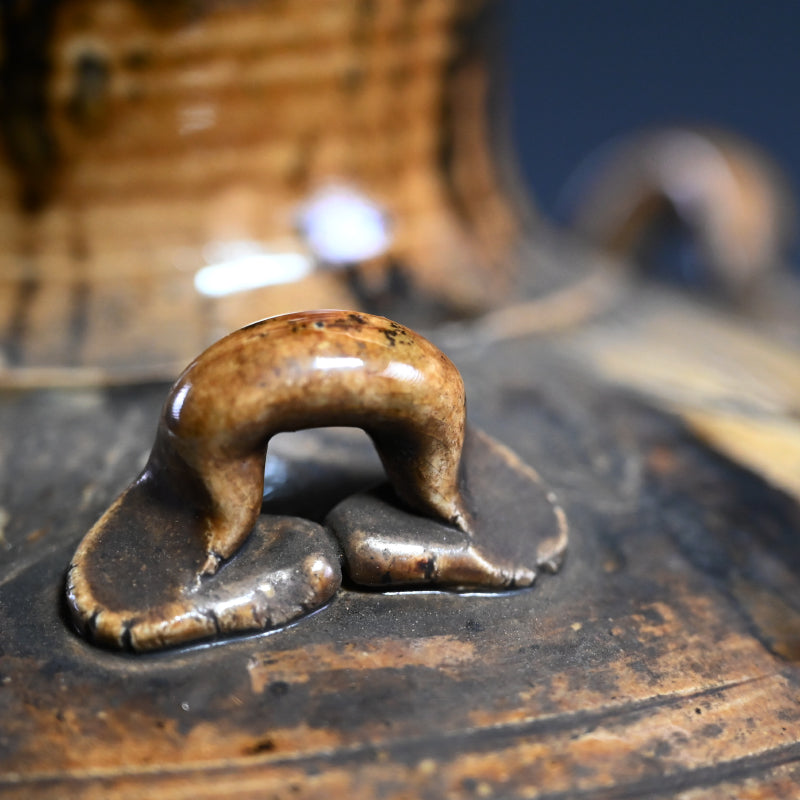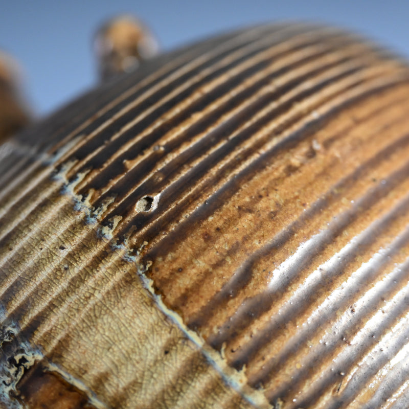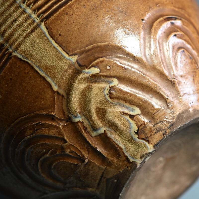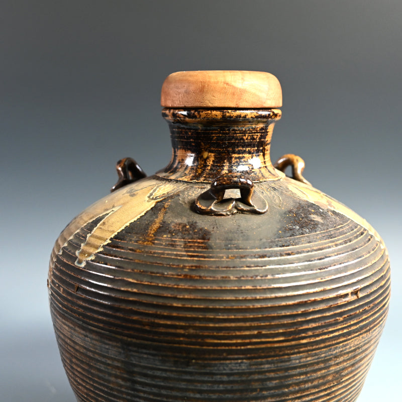 明治時代に熊本県の窯で作られた縞模様の壺です。首の部分から黄色い竹灰釉が流れ出ています。この壺は美しく作られており、多数の鋭いルーバーの下の底から上向きに弧を描く波模様が広がっています。3つのタイリングがネックを囲み、フレアリムの下のタイトなバンドに様式化されたフレットが刻まれています。明治 37年(1904年)6月に辻本家のために作られたと記された特注の木製栓が付いています。直径27cm、高さ33.5cmで完璧な状態です。希少な民芸陶器の伝統の見事な作品です。
