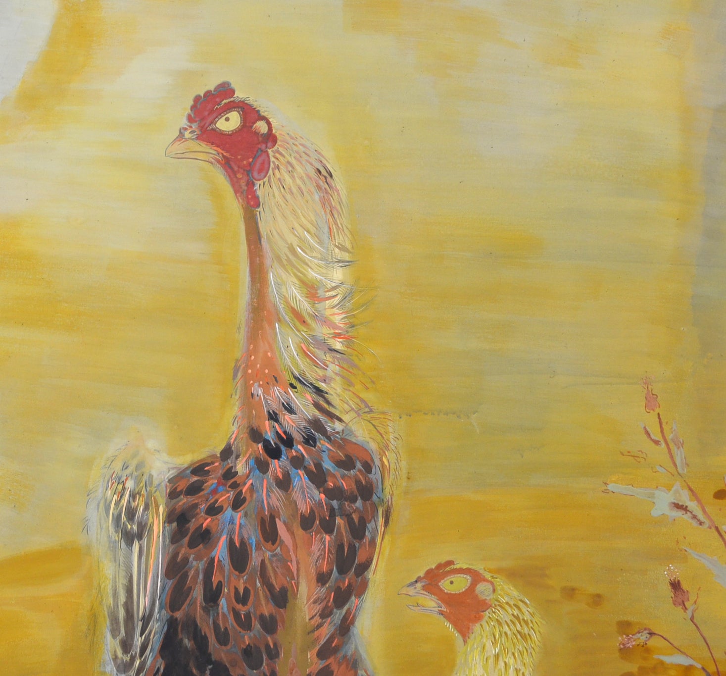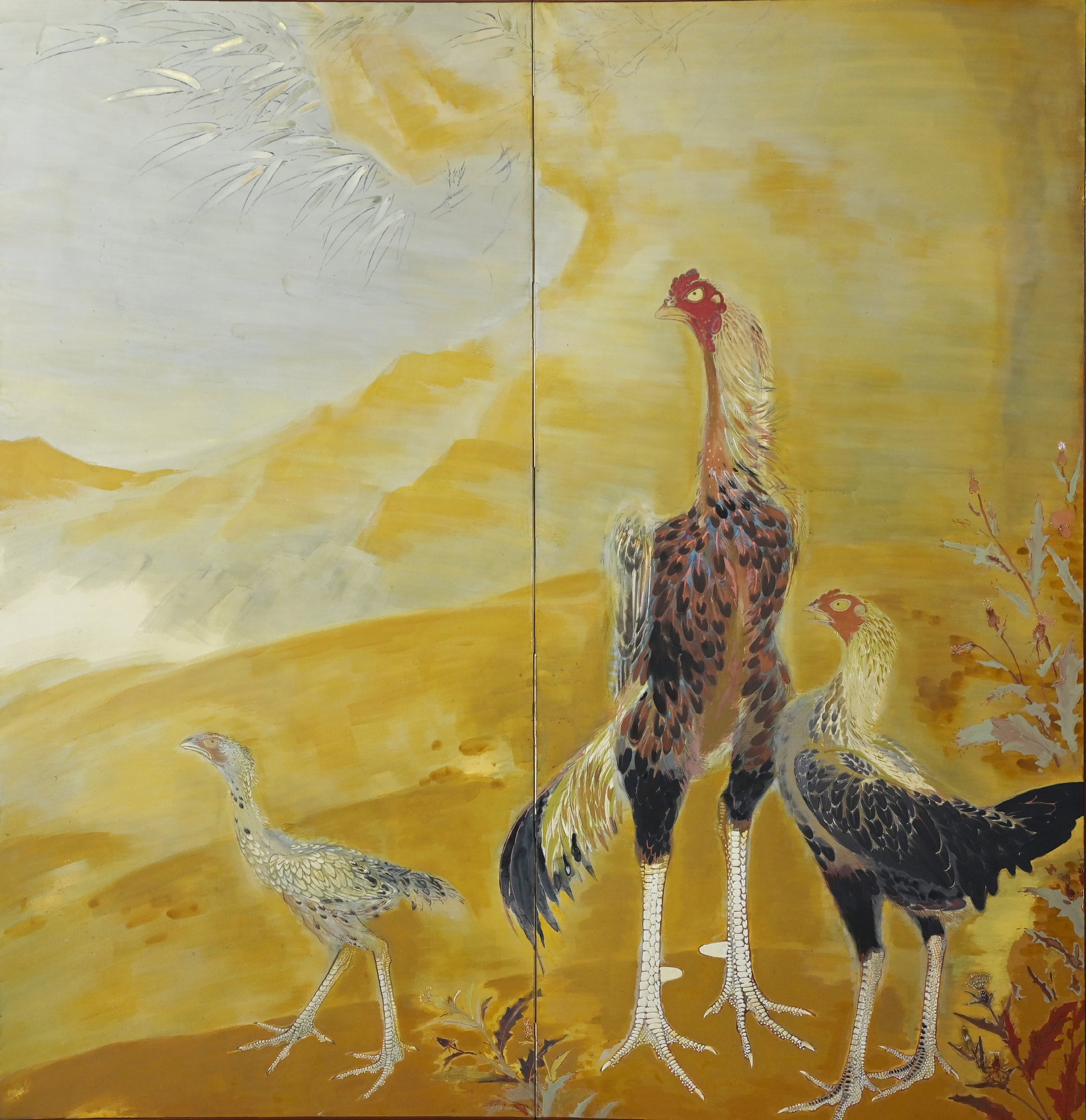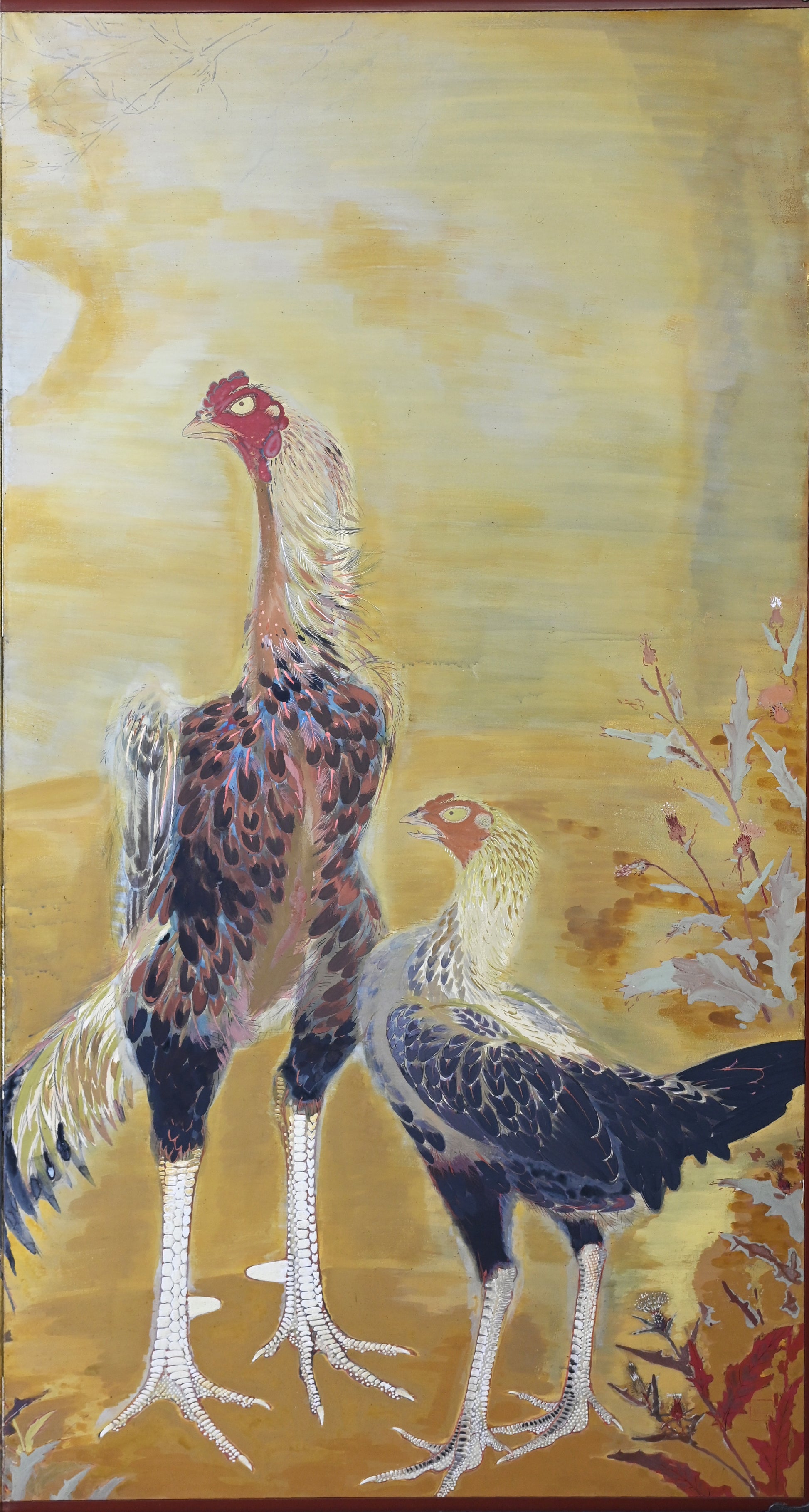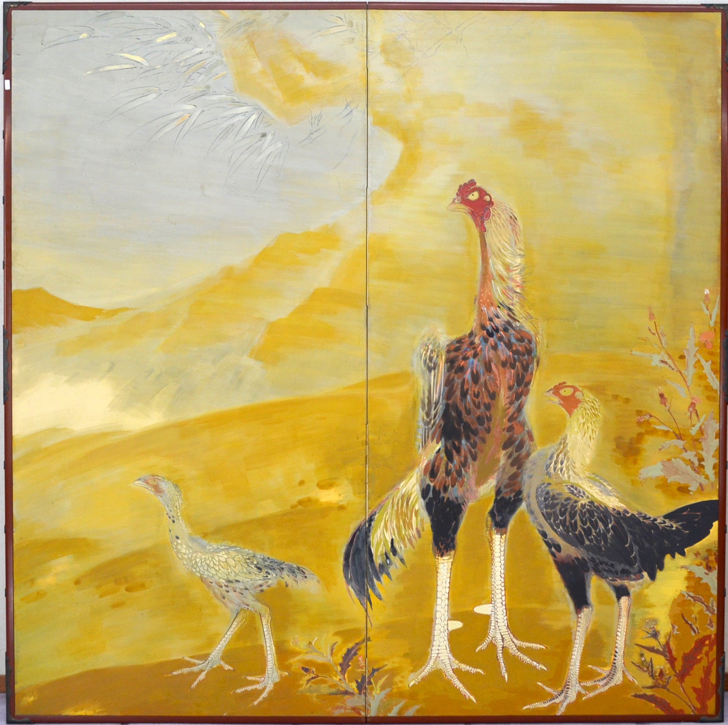 村嶋酉一作「闘鶏図」。1932年の帝展出品です。サイズは187×187cm、勇ましい闘鶏3羽を描いた作品で、保存状態は良好です。闘鶏の目や脚は立体的に彩色されており、間近で見るととても迫力があります。