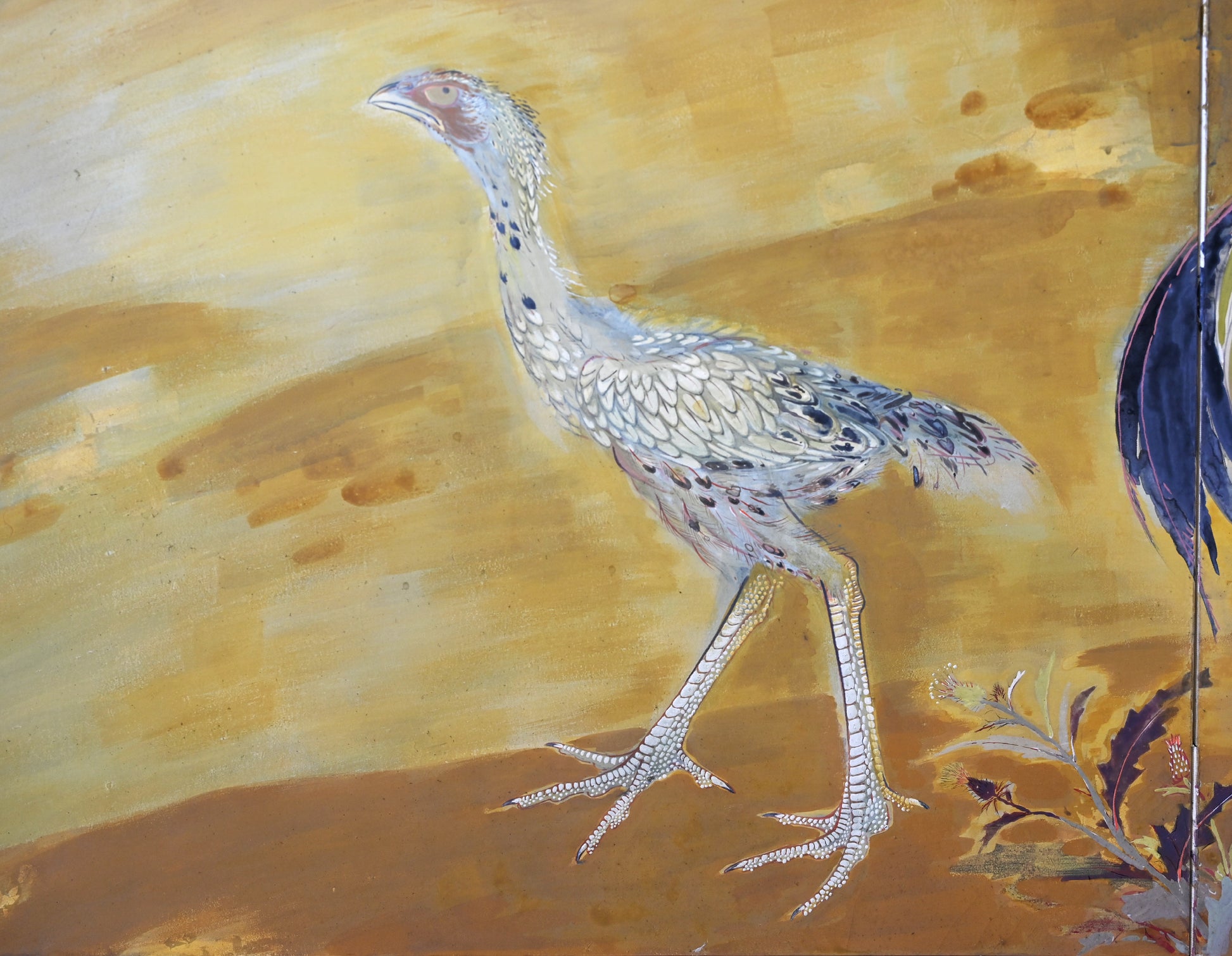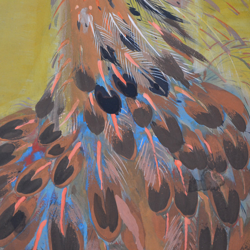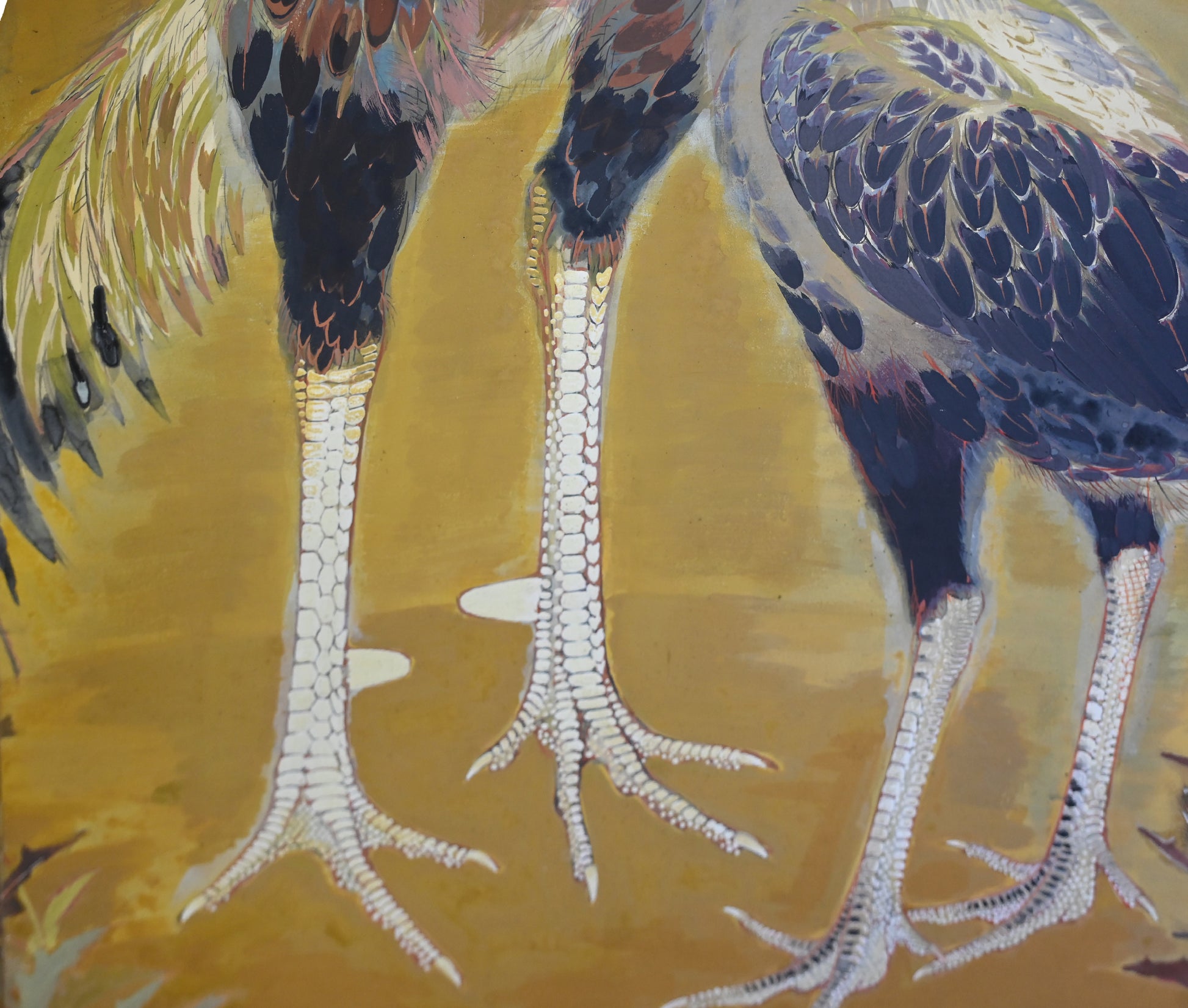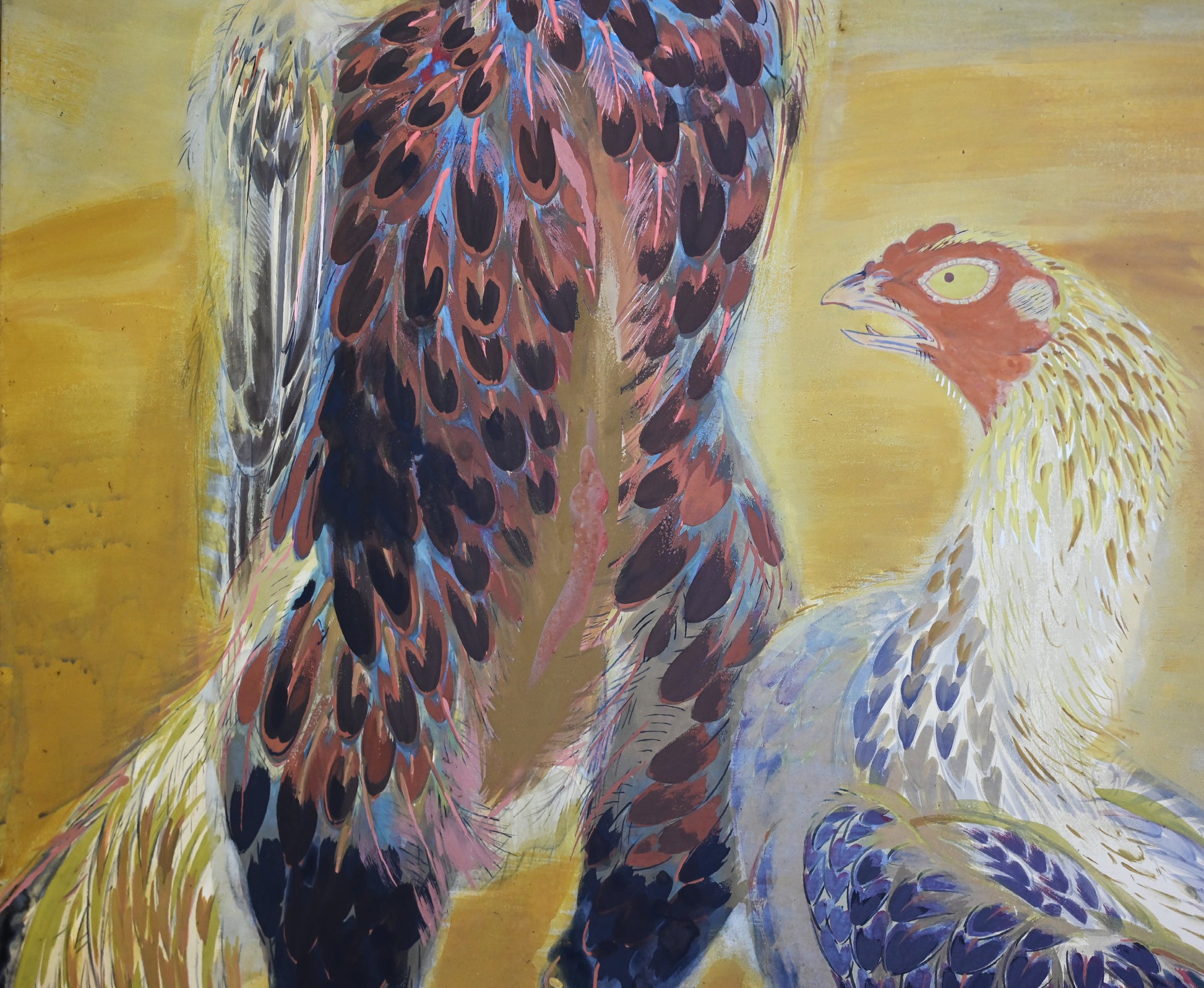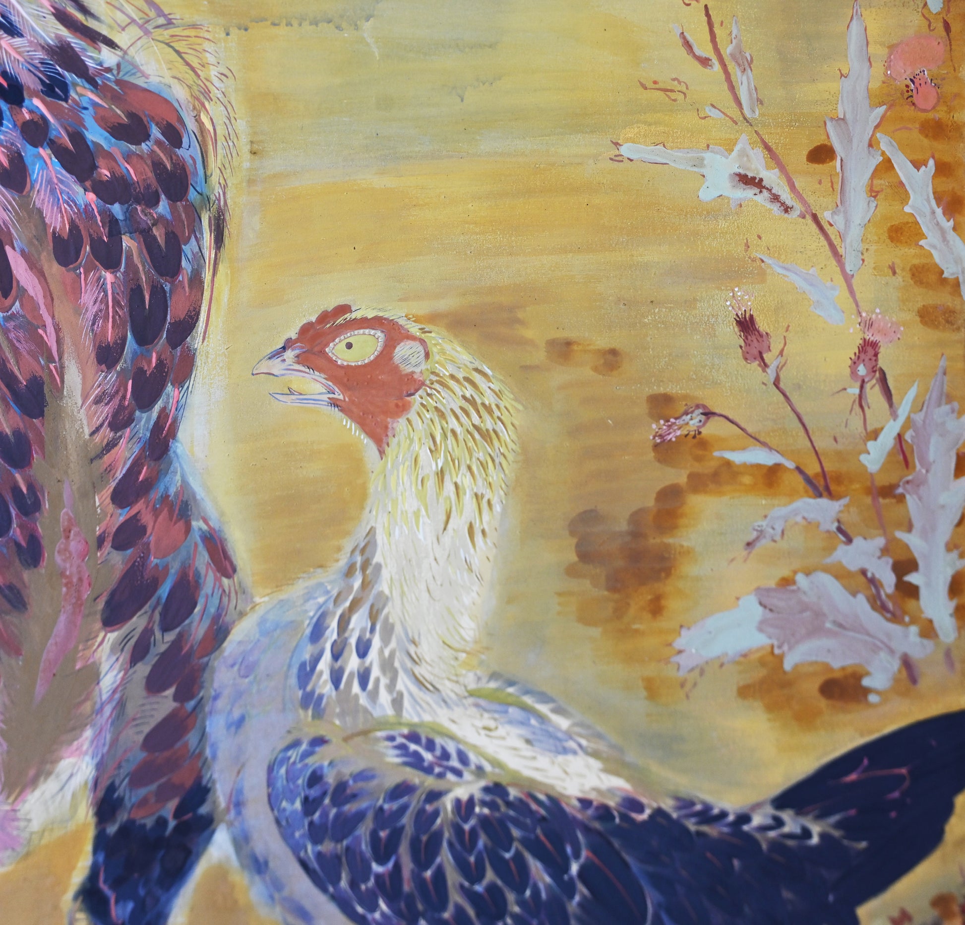 村嶋酉一作「闘鶏図」。1932年の帝展出品です。サイズは187×187cm、勇ましい闘鶏3羽を描いた作品で、保存状態は良好です。闘鶏の目や脚は立体的に彩色されており、間近で見るととても迫力があります。