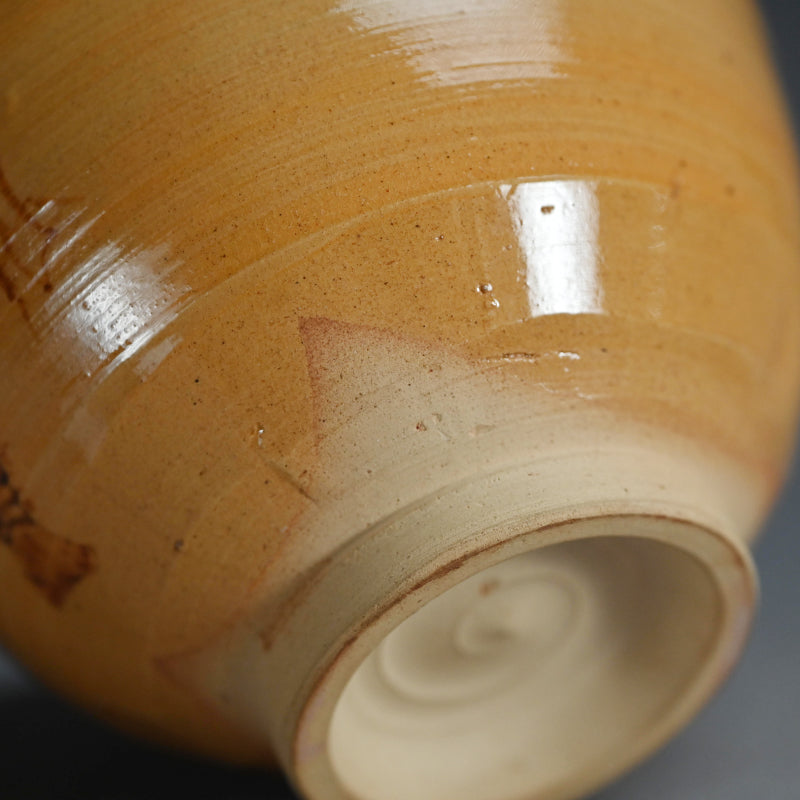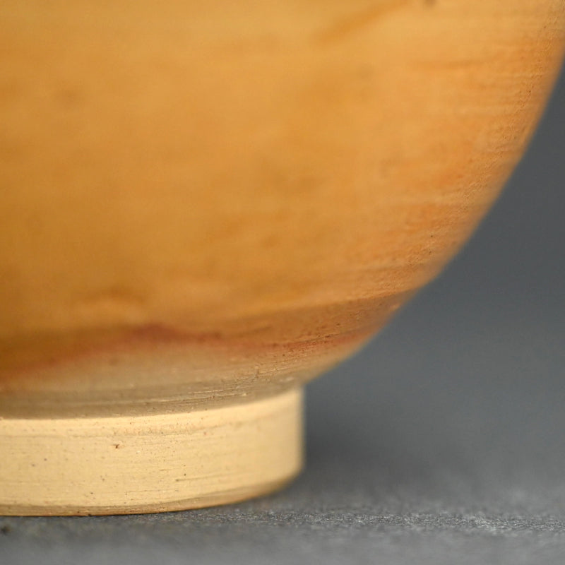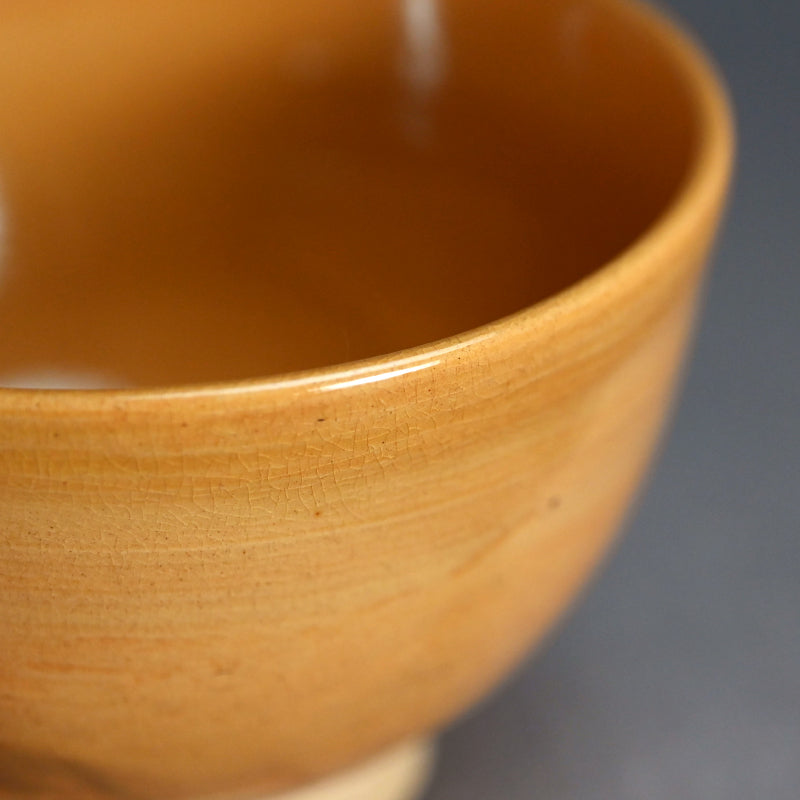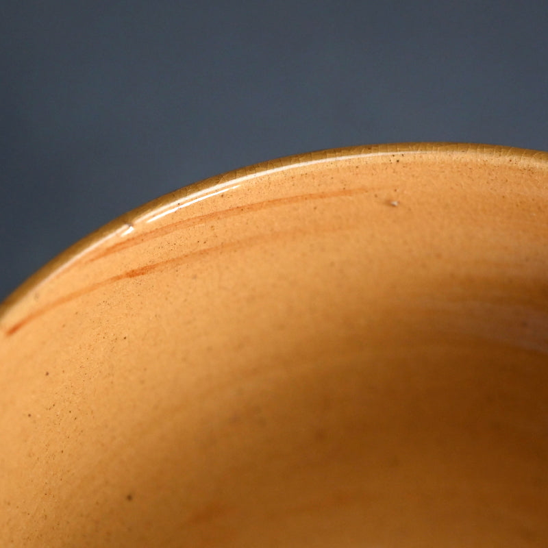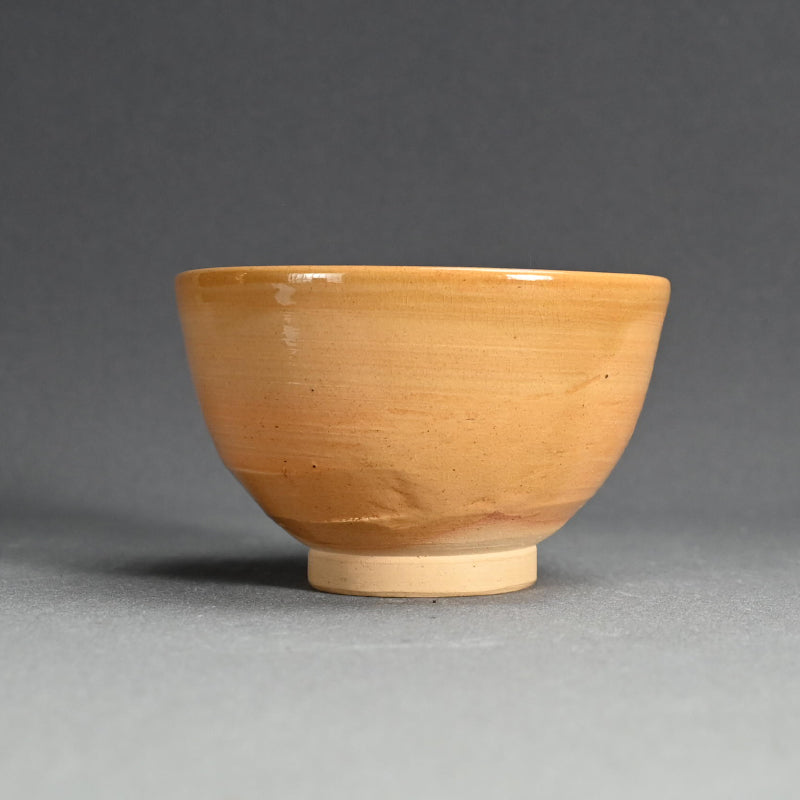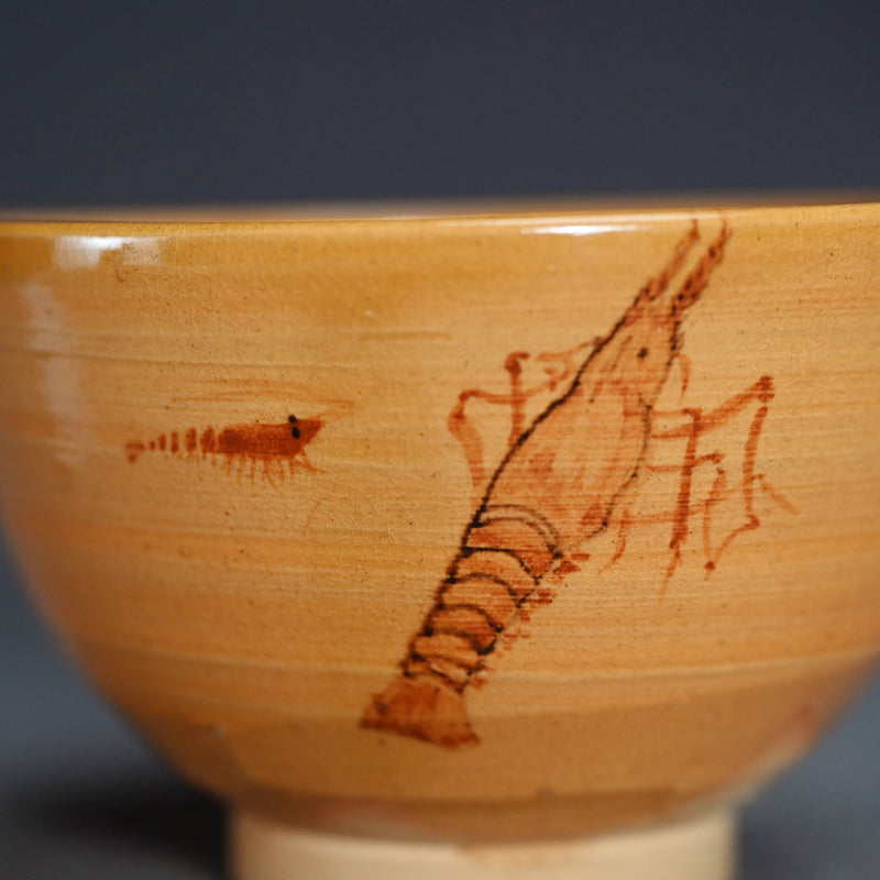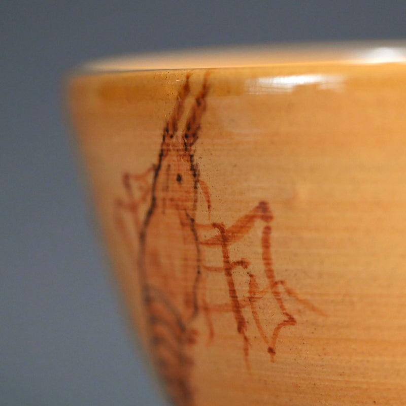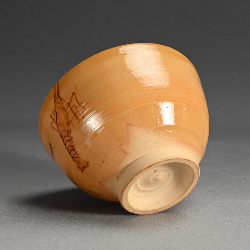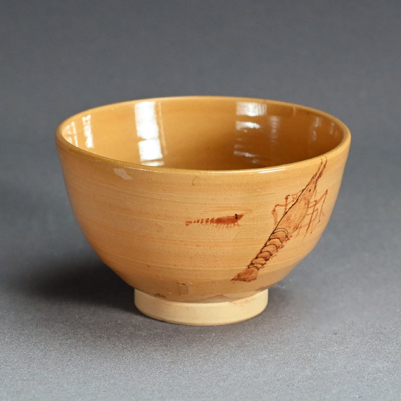 淡い釉をかけたこの茶碗は、日本西海岸のかつての城下町・松江の布志名の伝統古典作品で、側面にイセエビが駆け上がっています。側面には「雲寅」の署名が走り書きされています。雲寅は松市郊外の紫陰寺湖畔にあった窯元です。この茶碗は直径13cm、高さ8.5cmで 保存状態は良好です。「布志名焼 茶碗」と題された美しい桐箱に収められています。