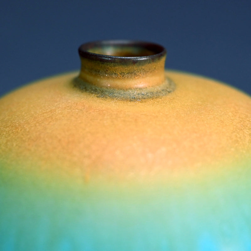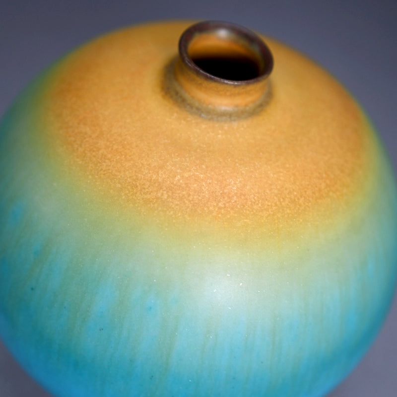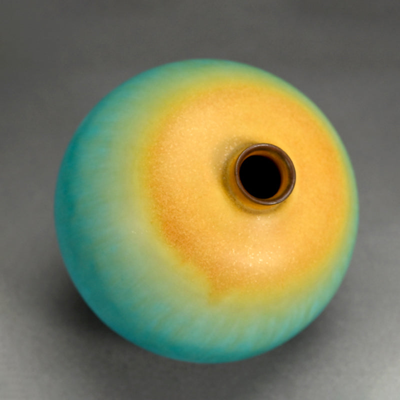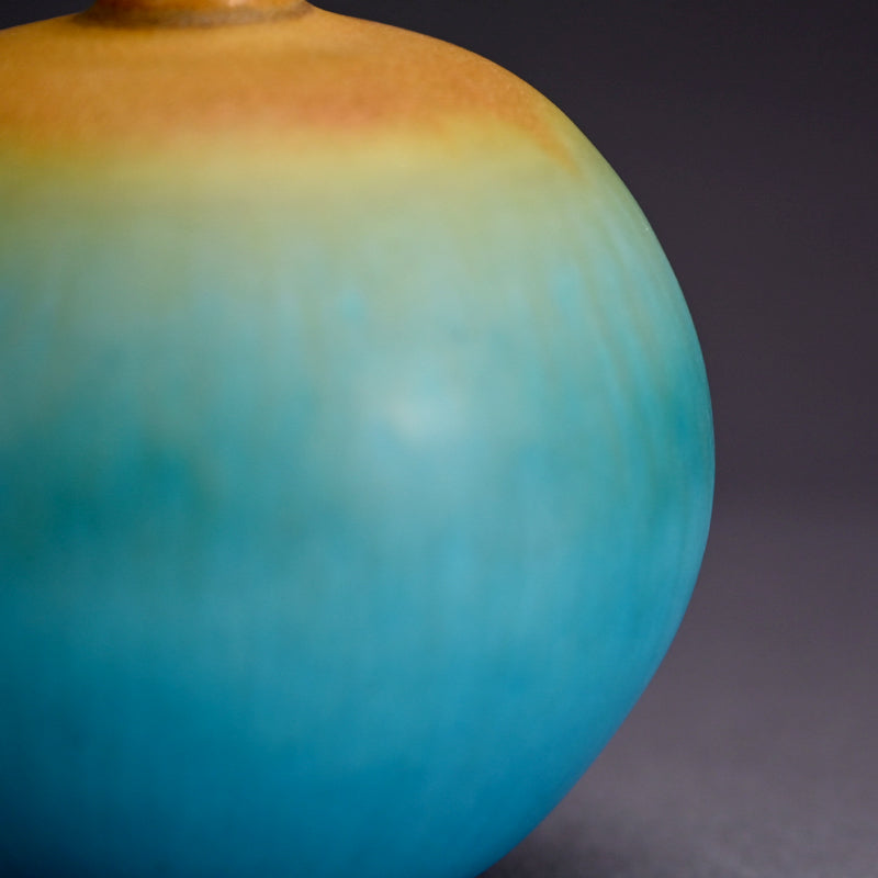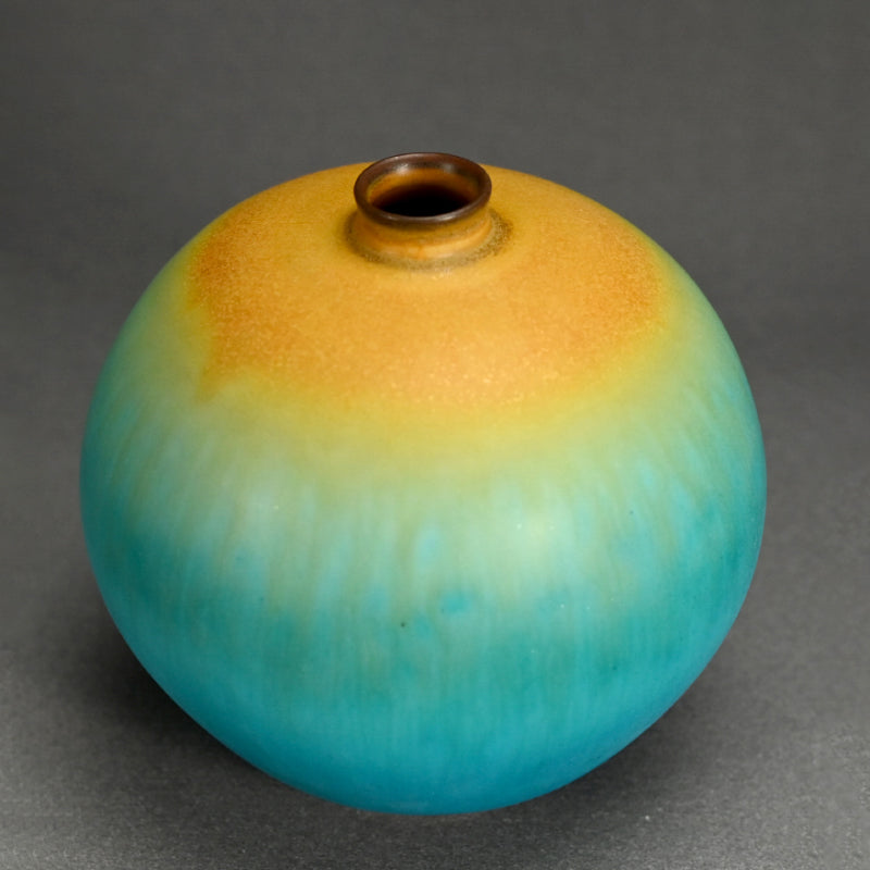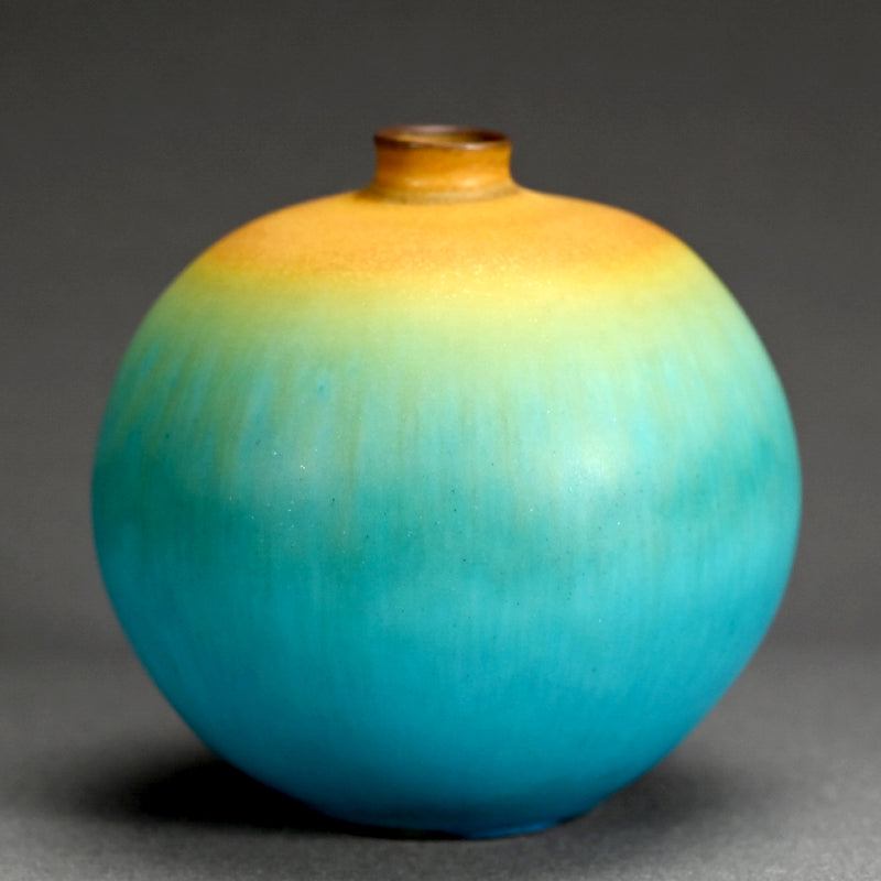 古野幸治作のこの小さな球形の花瓶には、カリブ海の日の出が炸裂し、オリジナルの署名入り木箱に収められています。オリジナルの陶釉は、空、海、そして大地の深淵の静寂と美しさを表現しています。直径13cm(5インチ)、高さはほぼ同程度で、状態は良好です。