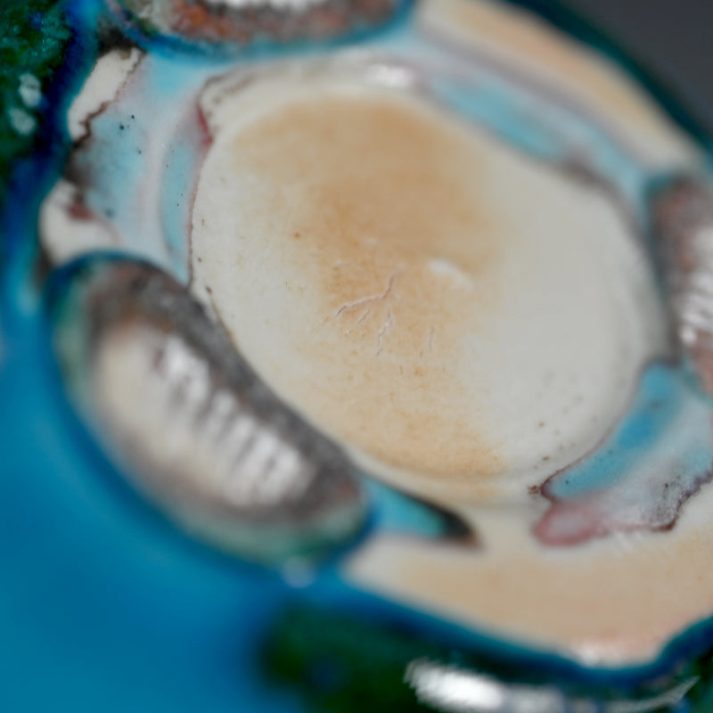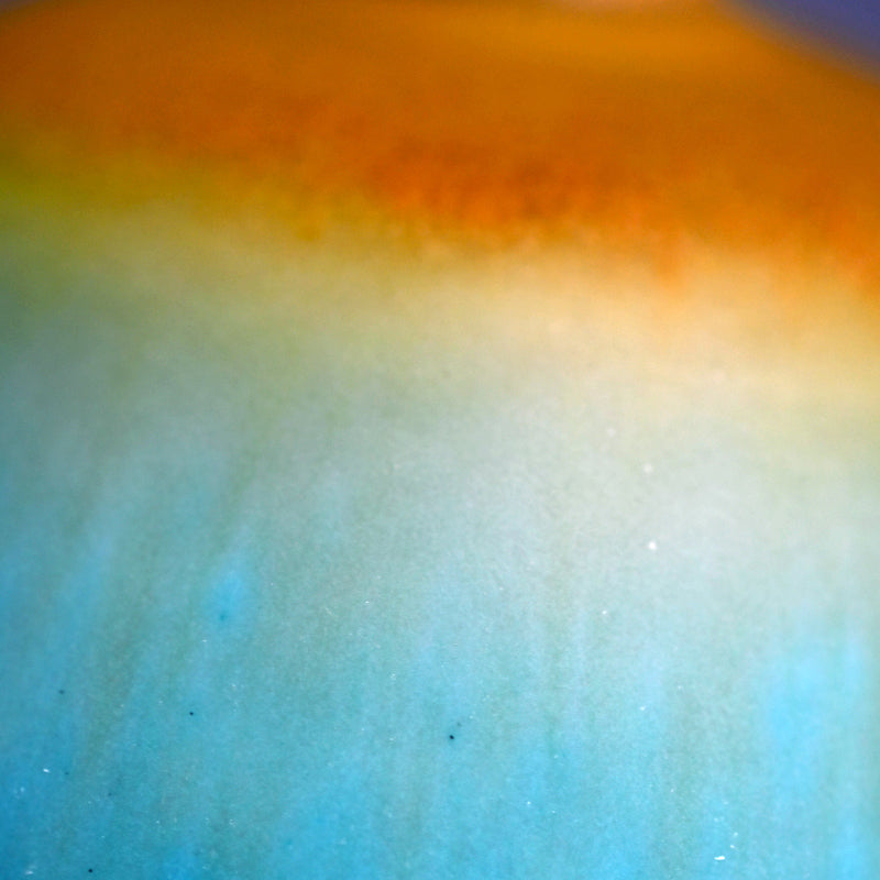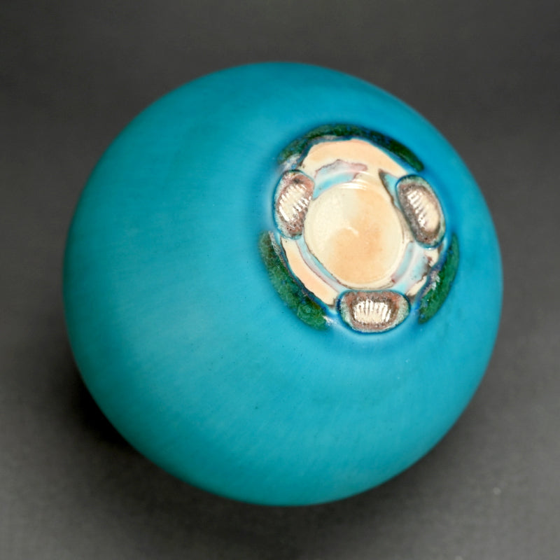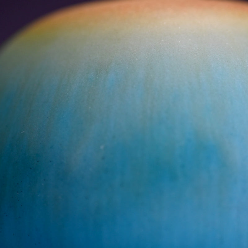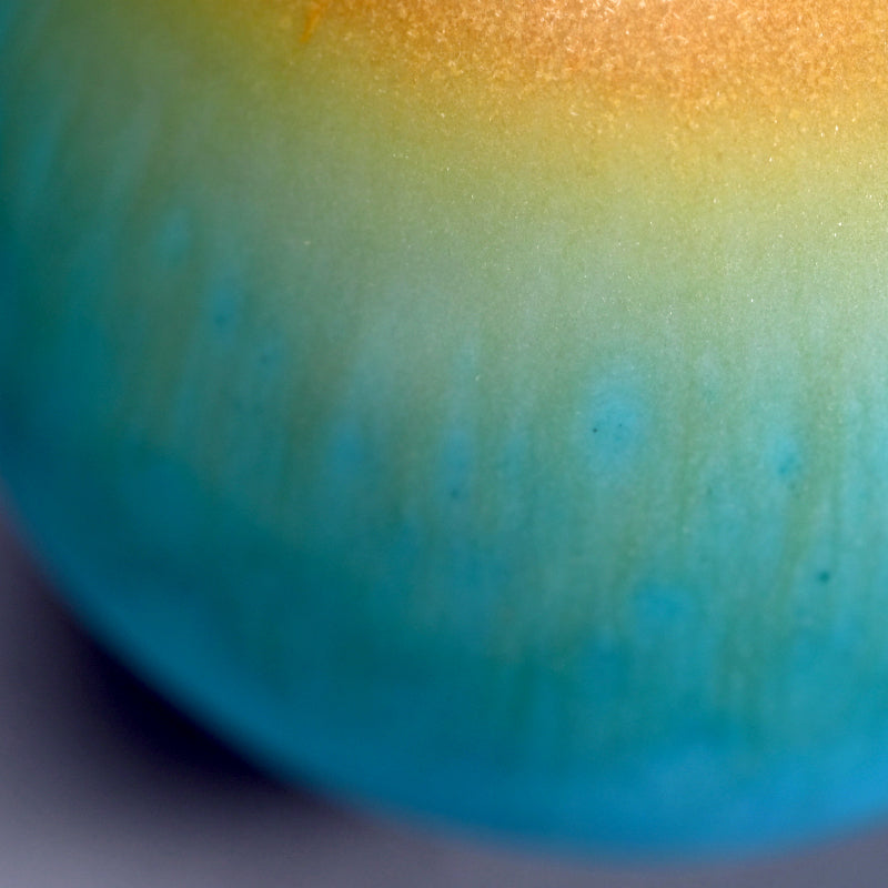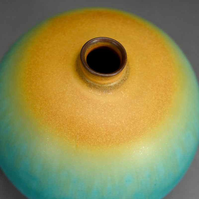 古野幸治作のこの小さな球形の花瓶には、カリブ海の日の出が炸裂し、オリジナルの署名入り木箱に収められています。オリジナルの陶釉は、空、海、そして大地の深淵の静寂と美しさを表現しています。直径13cm(5インチ)、高さはほぼ同程度で、状態は良好です。