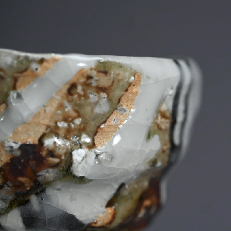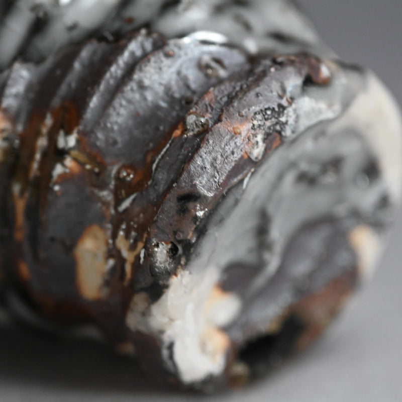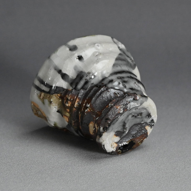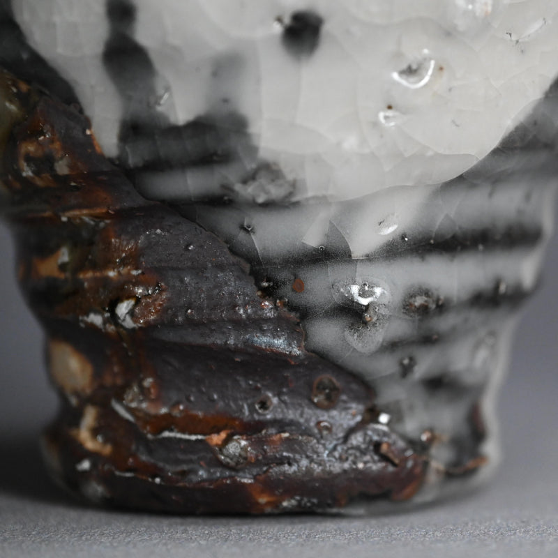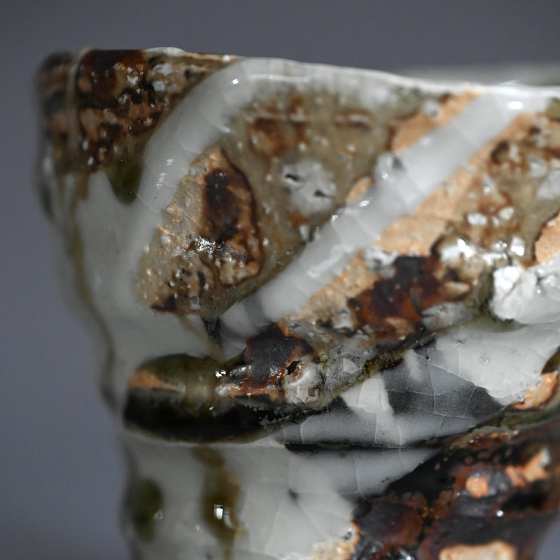 A new radical cup deeply scored by the fingers of Murakoshi Takuma as he raised it on the wheel, half covered in so much texture and variation in color it is a pleasure to both hold and view enclosed in the original signed wooden box titled Shunju Shochu Nomi.. It is 10 x 12 x 10 cm (4 x 5 x 4 inches) and is in excellent condition, directly from the artist.