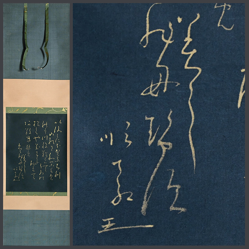 金色の文字が雨のように降り注ぐ、大石順教尼の書。1964年の詩解説と順教尼の略歴が入った、署名入りのオリジナル木箱に収められています。青い紙に金彩が施され、ベージュ色の絹布に水色で張り上げられ、祝賀的な赤い漆塗りの木製ローラーがあしらわれています。サイズは33 x 123 cm(13 x 49インチ)で、状態は良好です。