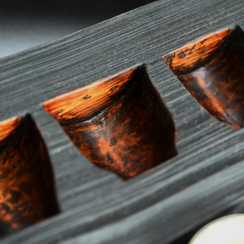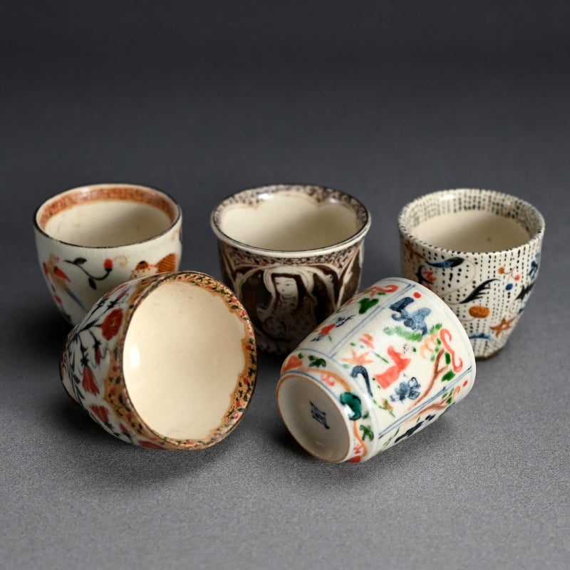 A set of five unique sake cups, each a slightly differing shape with varied designs by Masu Taka enclosed in a box hollowed out from a single split wood log covered in wiped on lacquer.  They are various widths, all roughly 5.2 cm (2 inches) tall and in excellent original condition.