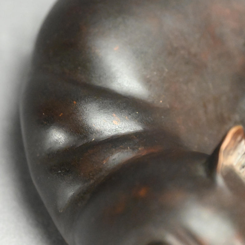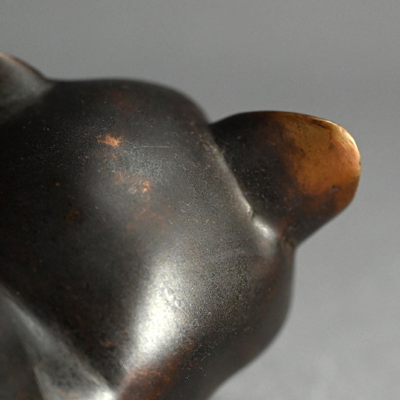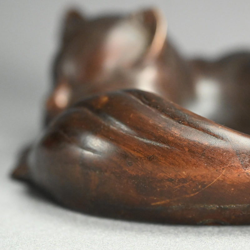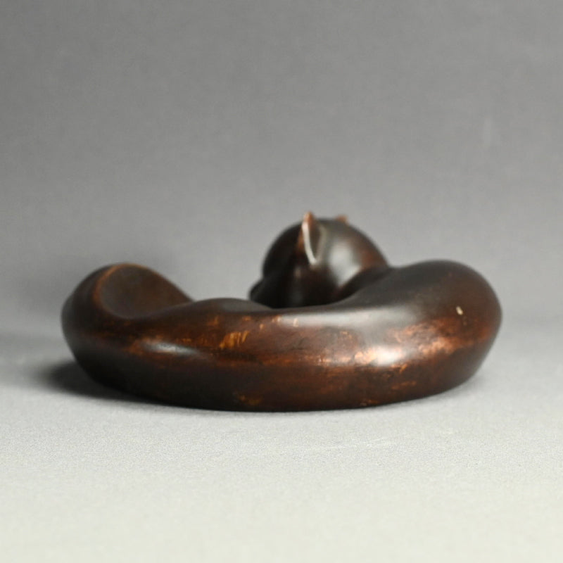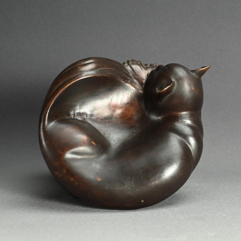 猫が丸まって眠るこの小さな置物は、1930~1950年代(アール・デコからポスト・アール・デコ時代)に作られたもので、下部はオリーブ色の緑青がかった金色のブロンズ製です。直径21cm、高さ7cmで 全体的に良好な状態ですが、縁には取り扱いに伴う若干の摩耗が見られます。