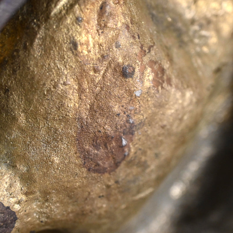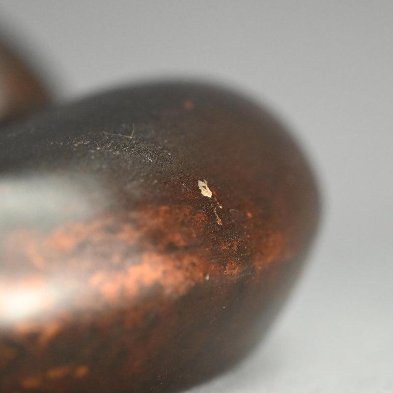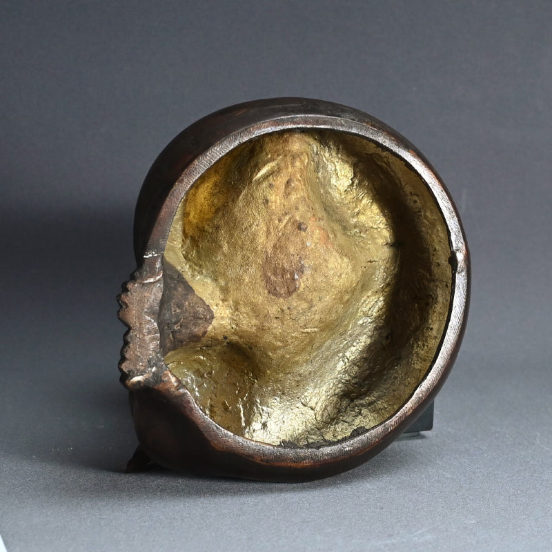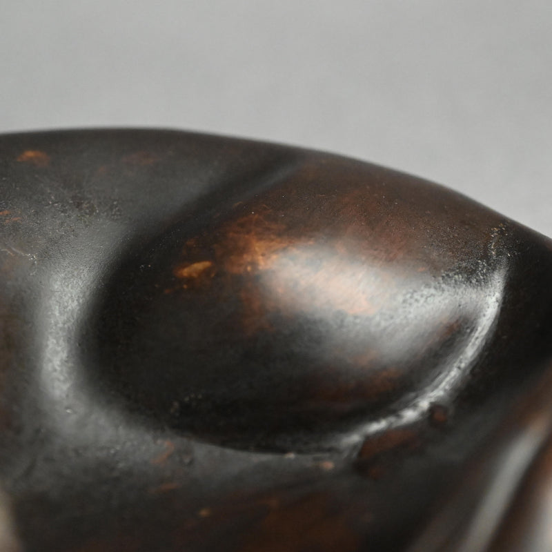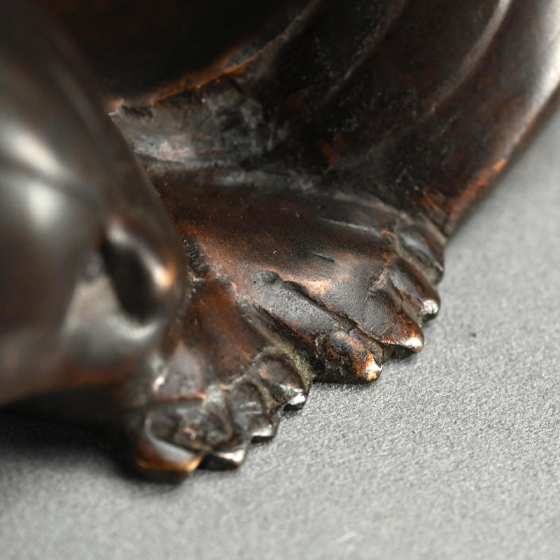 猫が丸まって眠るこの小さな置物は、1930~1950年代(アール・デコからポスト・アール・デコ時代)に作られたもので、下部はオリーブ色の緑青がかった金色のブロンズ製です。直径21cm、高さ7cmで 全体的に良好な状態ですが、縁には取り扱いに伴う若干の摩耗が見られます。