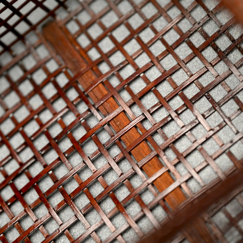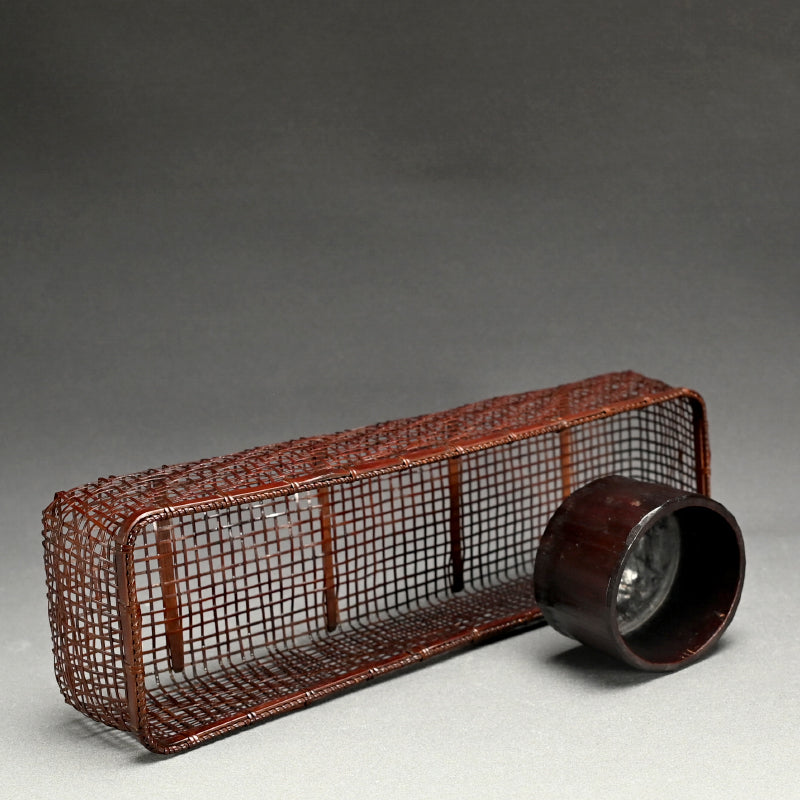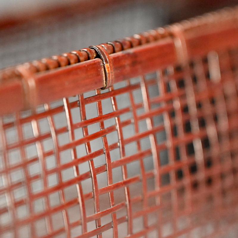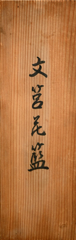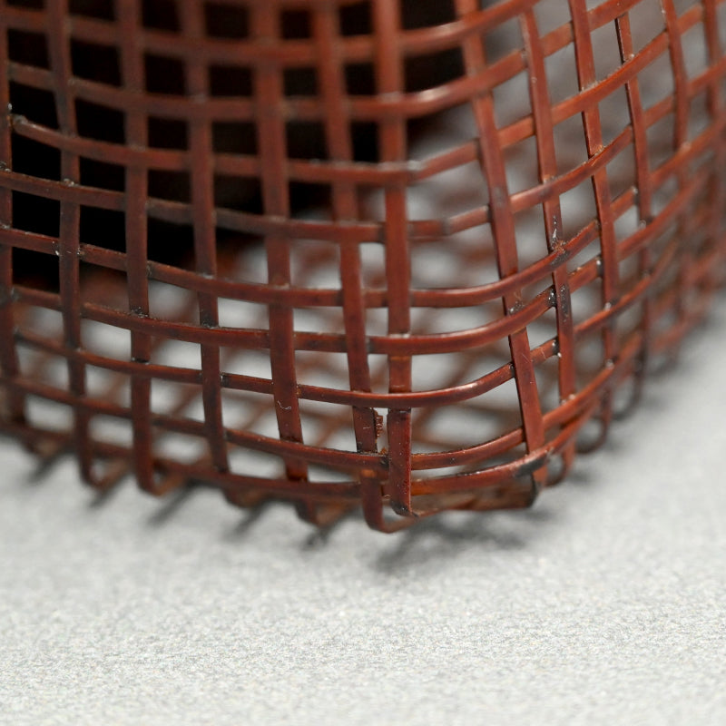 末村笙文による竹製の細長い編み込み建築用籠で、オリジナルの署名入り木箱「文筥花盛」に収められています。籠のサイズは38 x 12 x 8 cmで 状態は良好です。