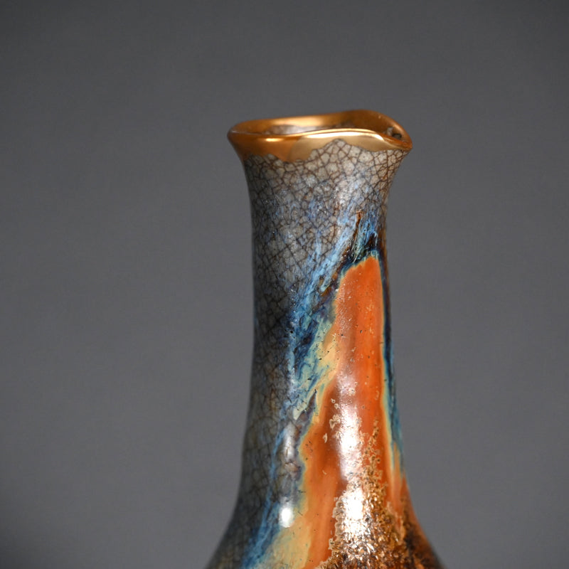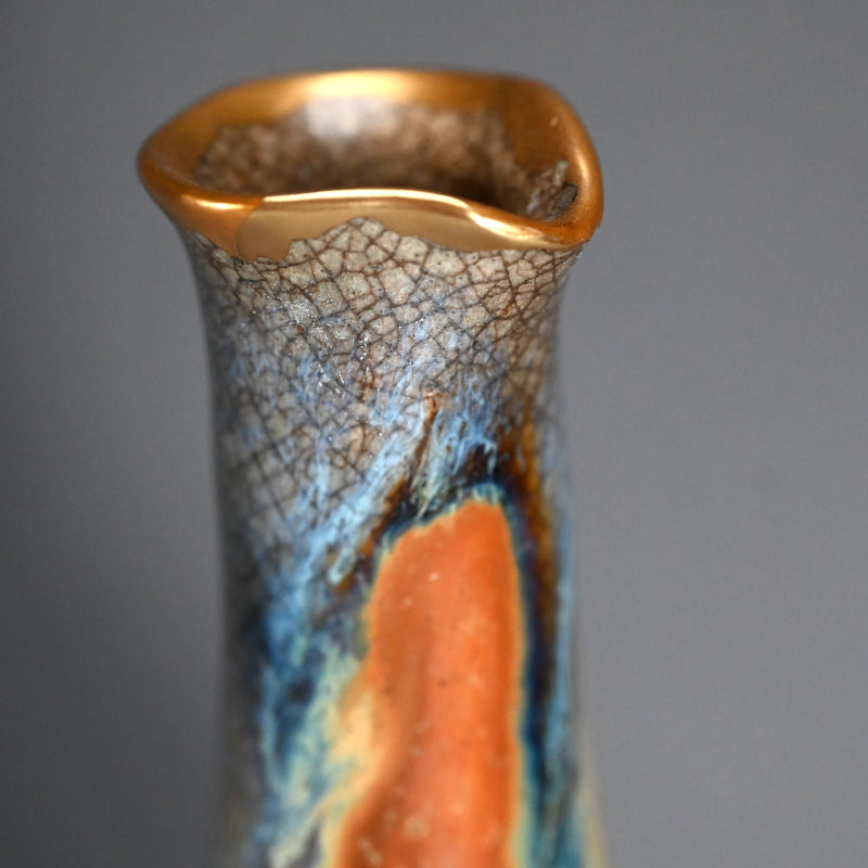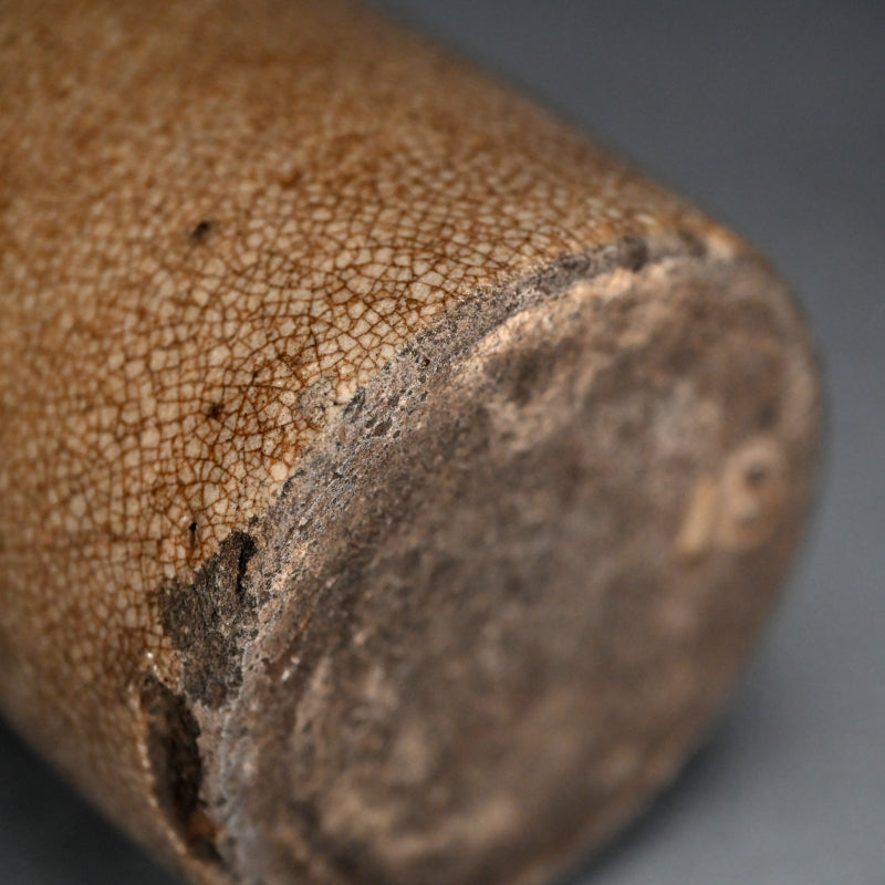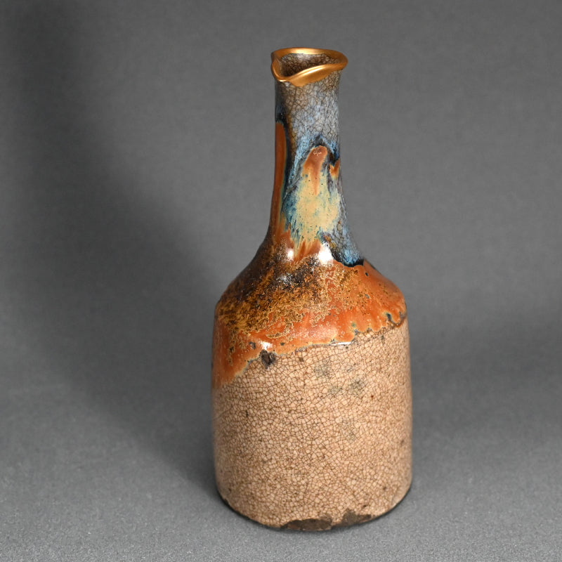 北大路魯山人 お墨付きの、「古瀬戸窯変徳利」と題された木箱に入った江戸時代前期の印象的な民藝徳利です。直径は 9.5 cm、高さは 21.5 cmです。縁は金で補修されており、何世紀にもわたる使用により側面と底部周辺に欠損が見られます。