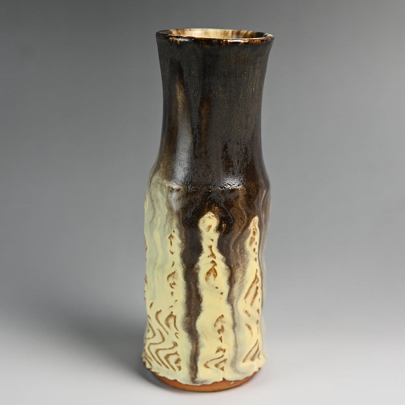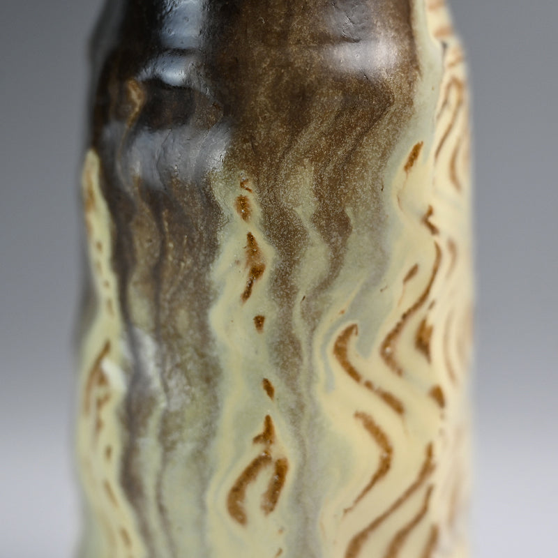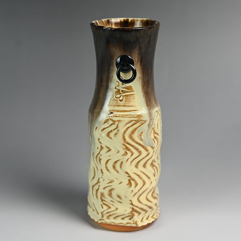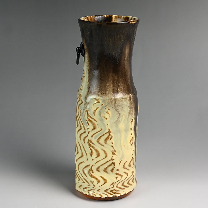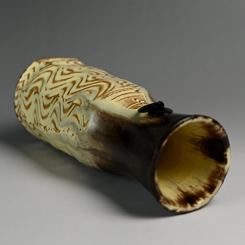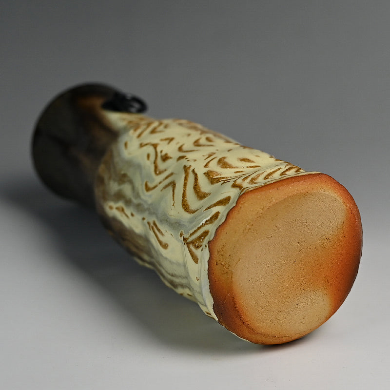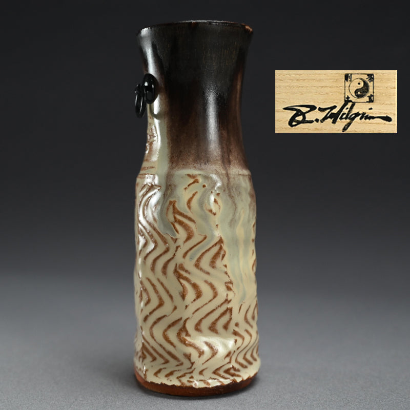 A hanging wall vase covered in cream glaze draped in sheets of black by Richard Milgrim enclosed in the original signed wooden box titled Konkoguro Kakehanaire. It is 6.5 cm (2-1/2 inches) diameter, 17.2 cm (7-1/2 inches) tall and in perfect condition, directly from the artist.