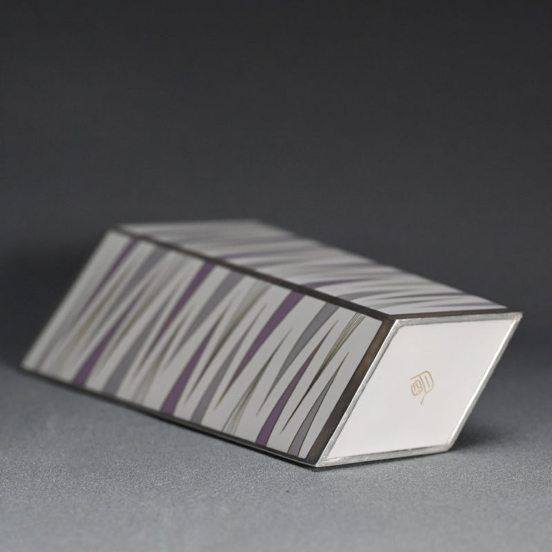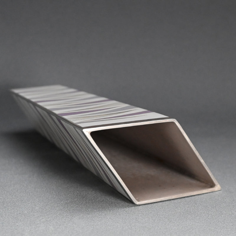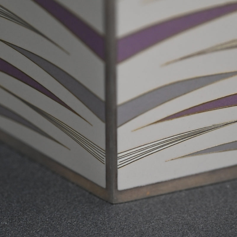 柴田 明によるパステルカラーのエナメルで彩られたこの優美な器は、2015年に制作され「有線七宝抽象文花器」と題されたオリジナルの銘木箱に収められています。サイズは15.5 x 8 x 25.5cmで 状態は良好です。