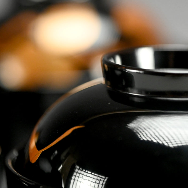 輪島塗伝統の井波唯志による美しい漆塗りの椀セットです。オリジナルの署名入り仕切り付き木箱に入っていて、蓋の内側と外側には 黒く磨かれた鏡面仕上げの表面に、本物の金粉と銀粉を使い、季節の花々を蒔絵で表現しています。
