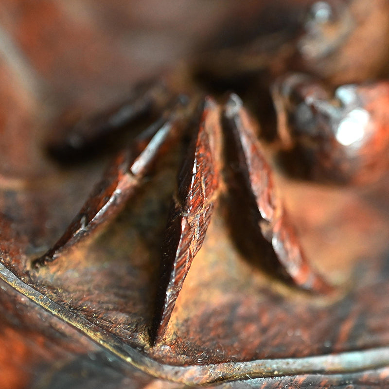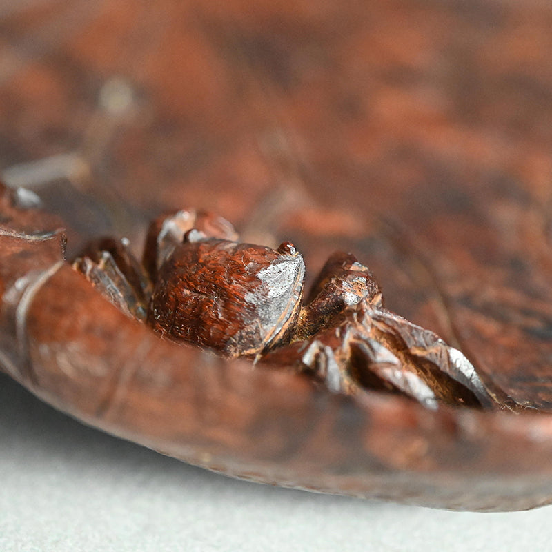 A large water crab in full relief trundles across the dilapidated surface of this lotus leaf shaped tray signed Senseki and enclosed in a modern wooden collectors box. The tray, dating from the first half of the 20th century, is 48 x 33 x 4.5 cm (19 x 13 x just less than 2 inches) and is in excellent condition.