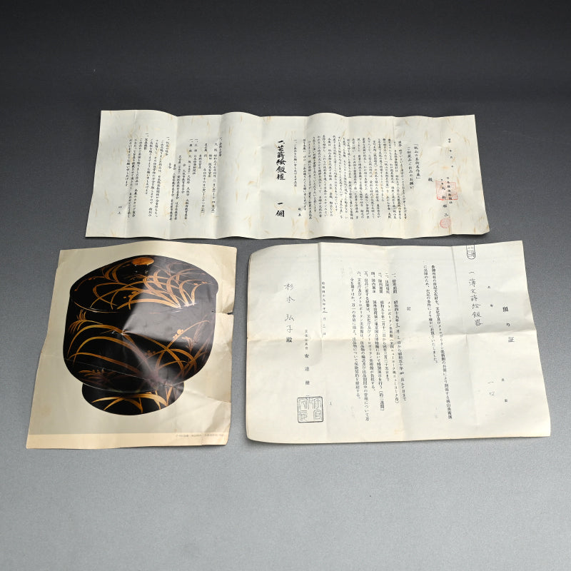 桃山時代(16世紀)の黒漆塗りに秋草の蒔絵を施した蓋付大鉢です。複数のカタログに掲載されており、1974年12月から文化庁の貸出同意を得てニューヨークのメトロポリタン美術館で桃山美術展のために貸し出された際の書類と、1982年4月2日から21日まで大阪と名古屋の2会場で開催された展覧会の貸出契約書が付属しているとても貴重なものです。直径 20 cm、高さ 18 cmで、400 年以上前の作品であることを考えれば全体的に良好な状態です。少なくとも 2 冊の本、メトロポリタン美術館展カタログ (1975 年、120 ページ、項目番号 68) と桃山美術名作展 (1982 年、37 ページ、図 39) に掲載されています。 両方の博物館カタログが含まれています。