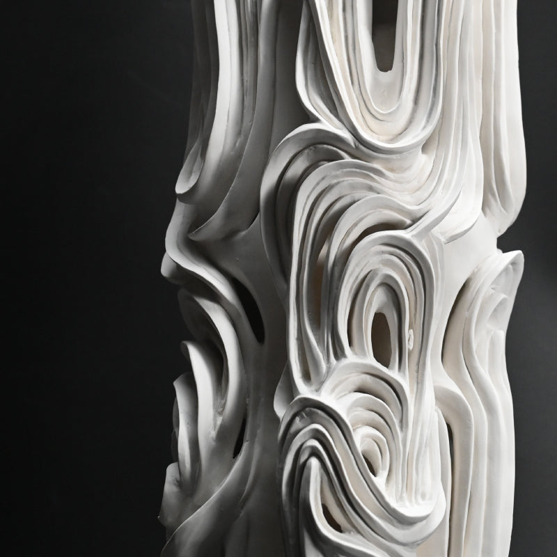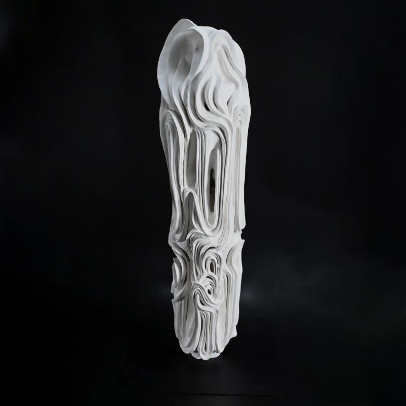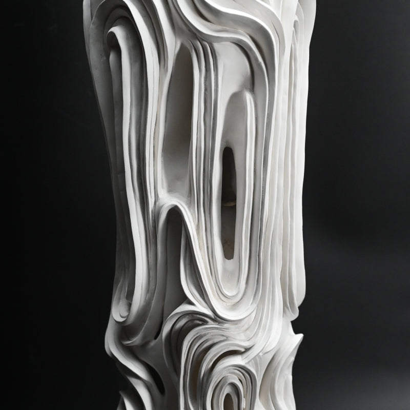A large sculpted organic form by the rising young female star Goto Miho rendered from sheer white porcelain titled Kaku. Not simply a carved pillar, it is made simultaneously of an inner and outer layer, with hollows and caverns visible in places between the deeply scored runes outside. It is 1 meter (3 feet) tall and in excellent condition, mounted on a steel plate, directly from the artist this spring.