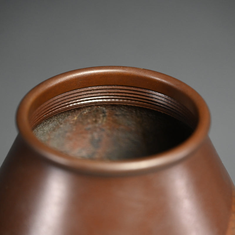 初代 内免紫峰(1904-1987)は、15歳より市岡紫雲に師事し、金工を学び、1925年に自身の工房を設立しました。彼の作品は1930年の国立尚古展で初めて公開されました。2年後、彼はベルギー万国博覧会で賞を受賞しました。彼は1960年代半ばの混乱期にも精力的に活動を続け、1967年に高岡市から文化勲章を受章しました。高岡市立博物館には作品が所蔵されています。1987年に亡くなるまで、伝統的な青銅器の普及に尽力し、息子で2代目の紫峰は1957年から父に師事しました。彼もまた、1974年の高岡伝統工芸展で最優秀賞を受賞するなど、高い評価を受けています。