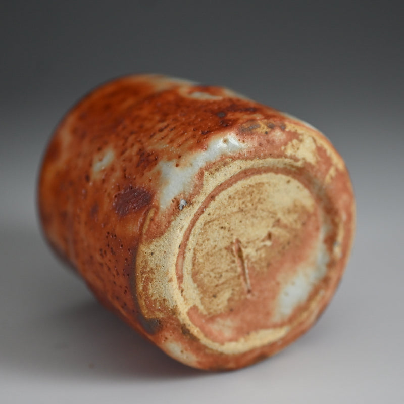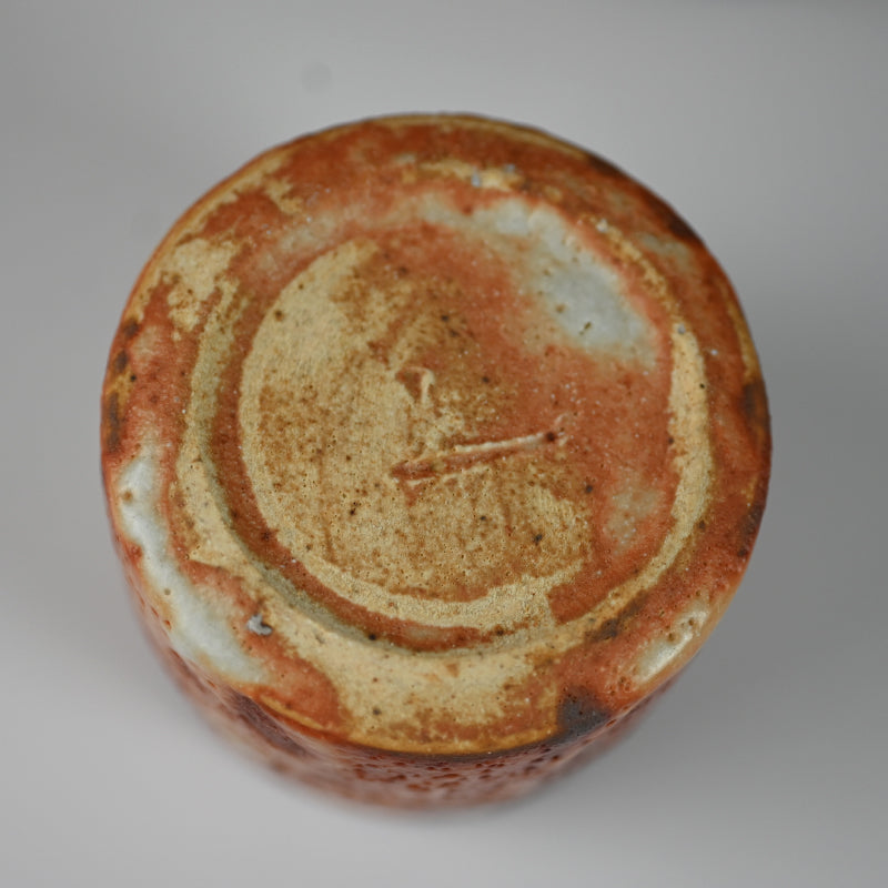A set of five rust tinged Shino cups by Living National Treasure Kato Kozo enclosed in the original signed wooden box titled Shino Yunomi. Each is roughly 7 cm (2-3/4 inches) tall and all are in excellent condition.