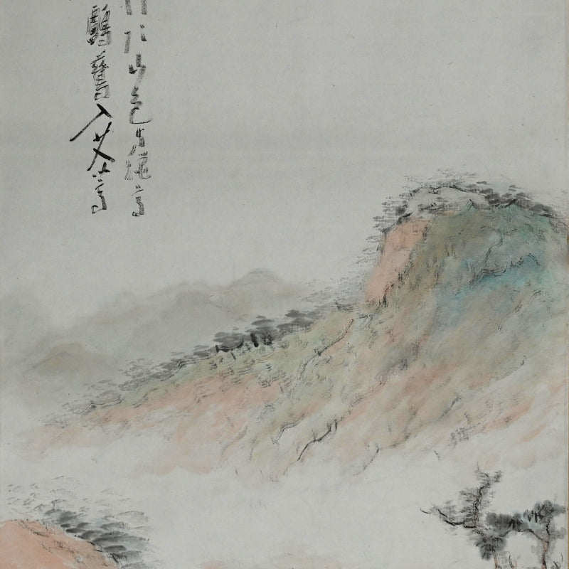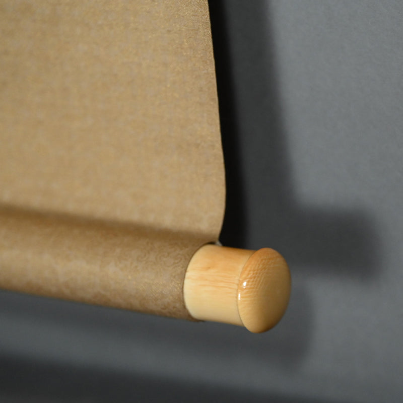 橋本独山によるこの風景画は、繊細な色彩の筆致で描かれ、オリジナルの署名入りの二重木箱に収められています。紙に顔料と墨で彩色され、金襴の縁飾りが施され、本金糸で縁取りされた象牙の縁飾りが付いています(輸出の場合は、縁飾りは変更されます)。本幅は47.5cm×212cm(19×83.5インチ)で、状態は良好です。