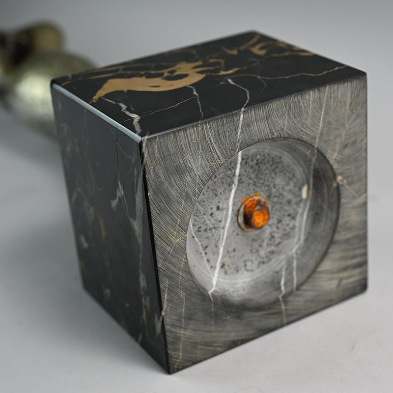 小林 尚珉による 重い大理石の台座に載せられた打ち出し金属の彫刻です。オリジナルの署名入り木箱「母子像」に収められています。全体の高さは60.5 cm、彫像自体の高さは48.5cmで 状態は良好です。台座を含めた重量は10.4kgです。