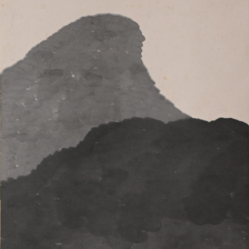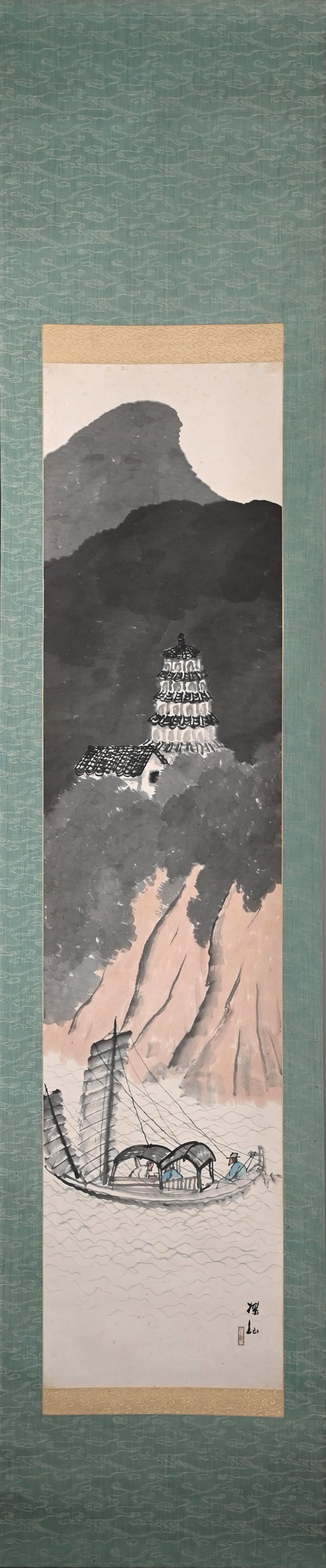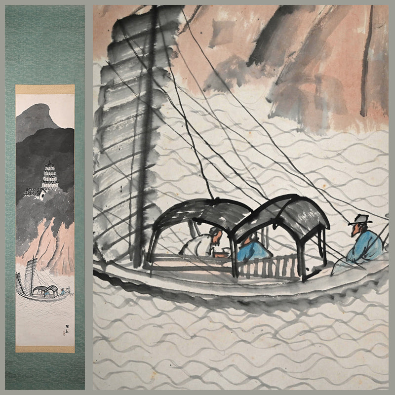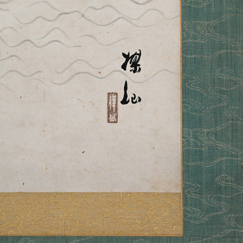 平井梅仙による静謐な図像。海へと続く断崖にそびえる壮大な楼閣の見守る下を、船頭が行き交う様子が描かれています。この作品は、署名入りの「夏帆船旅」と題されたオリジナルの木箱に収められています。「梅」という字は、大正時代の初期の作品であることを物語っています。墨で描かれた紙は、涼しげな夏の青を基調とした麻布の縁取りで包まれ、雲の模様が細く描かれ、その先には骨の巻き模様が描かれています。よく見るとかすかなシミが見られますが、非常に良好な状態です。