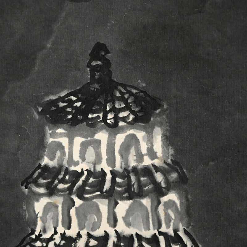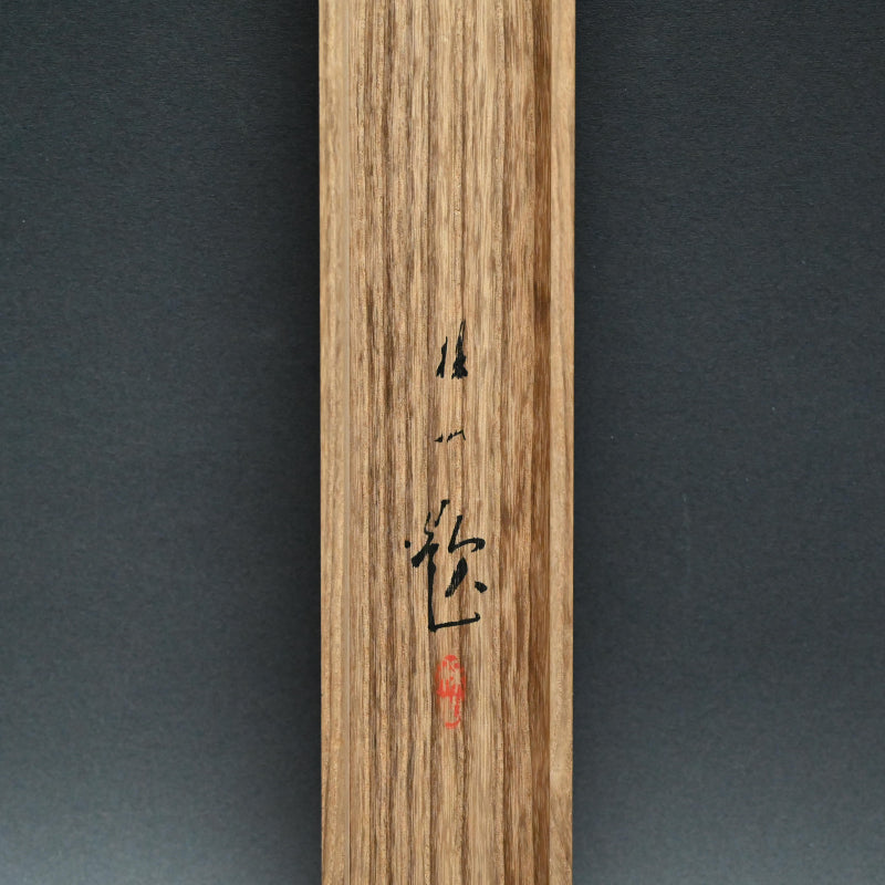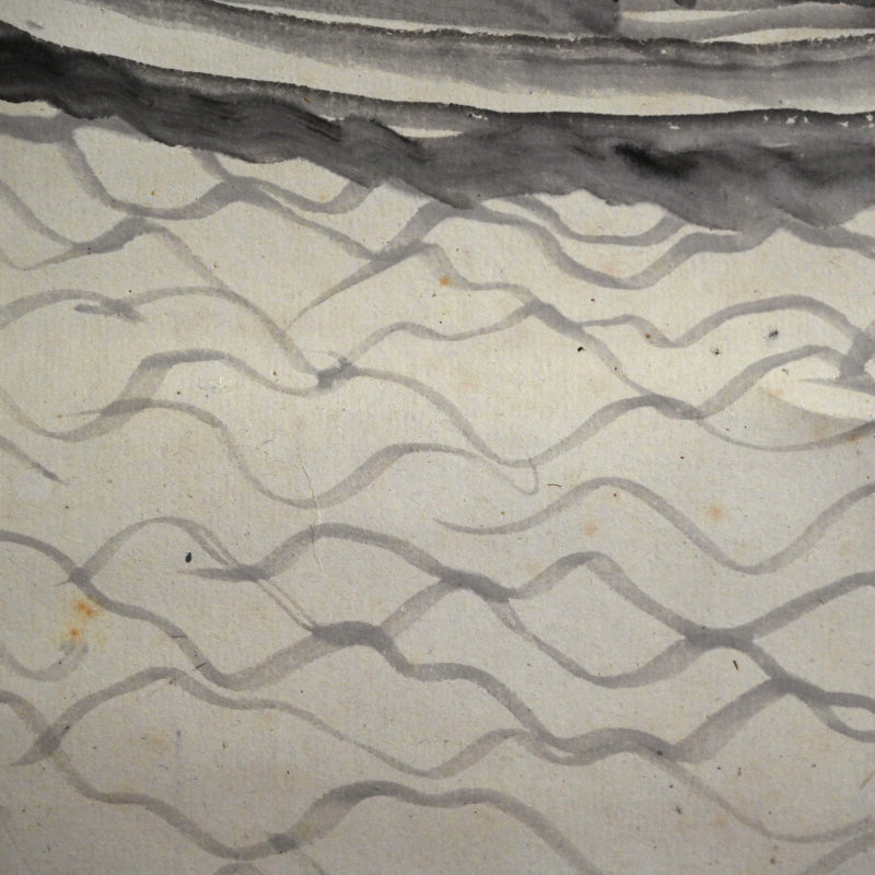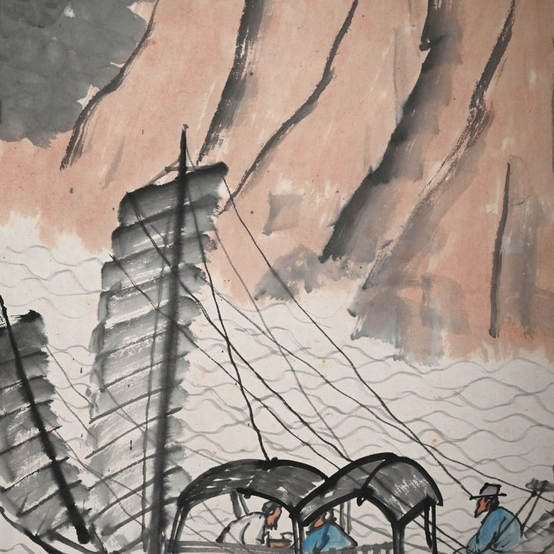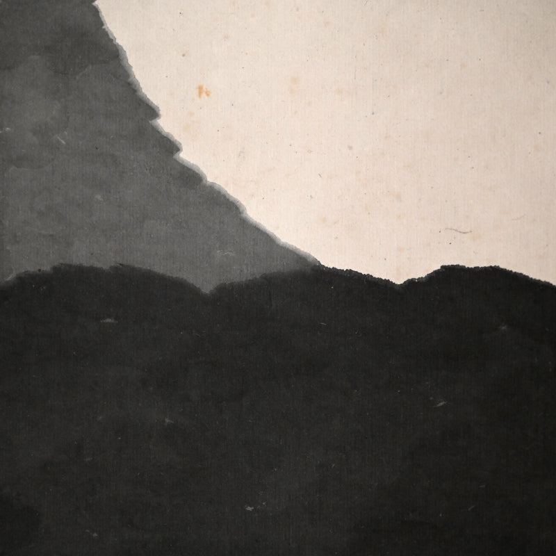 平井梅仙による静謐な図像。海へと続く断崖にそびえる壮大な楼閣の見守る下を、船頭が行き交う様子が描かれています。この作品は、署名入りの「夏帆船旅」と題されたオリジナルの木箱に収められています。「梅」という字は、大正時代の初期の作品であることを物語っています。墨で描かれた紙は、涼しげな夏の青を基調とした麻布の縁取りで包まれ、雲の模様が細く描かれ、その先には骨の巻き模様が描かれています。よく見るとかすかなシミが見られますが、非常に良好な状態です。