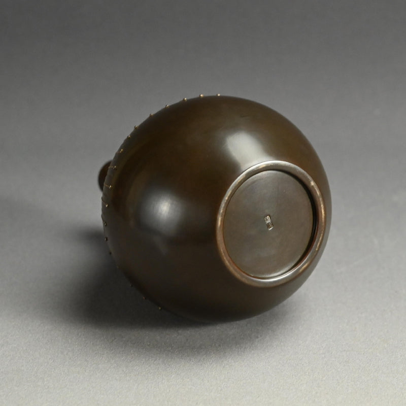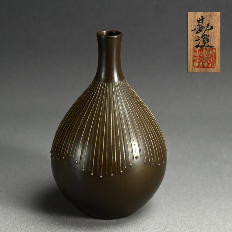 現代の鋳金界の巨匠、般若 勘渓による洗練されたデザインの作品です。オリジナルのサイン入り木箱に収められています。直径13cm、高さ20.5cmで 状態は良好です。