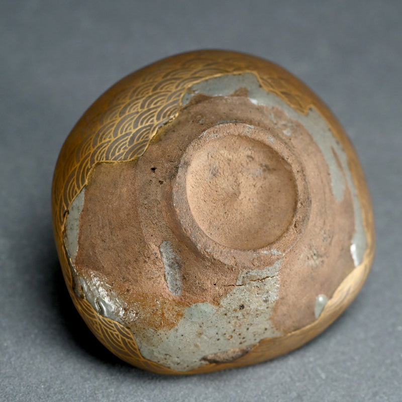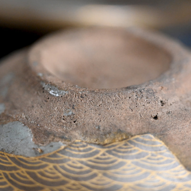 16~17世紀の唐津皿5枚セットには 金で覆われた漆の補修が施され、その上に波やその他の模様がデザインされており、驚くほどの労力 (純金だけでなく) が費やされています。最大の皿の直径は12cm、最小の皿の直径は10.5cmです。