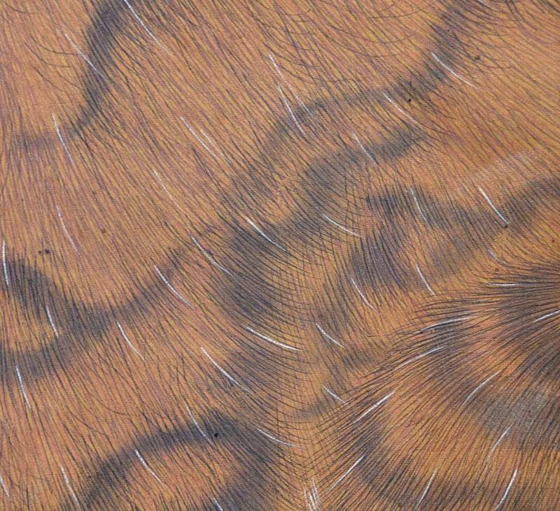 A neko-tora (Cat like tiger) in typical Nagasaki School design looks over its shoulder on this finely painted work signed Tsuneyama Gen’ei. Pigment and ink on silk, it has been completely remounted without overpainting. The scroll measures 40 x 174 cm (15-1/2 x 68-1/2 inches) and is in fine condition. The silk canvas is bordered in green silk with white piping and retains the original antique wood rollers.