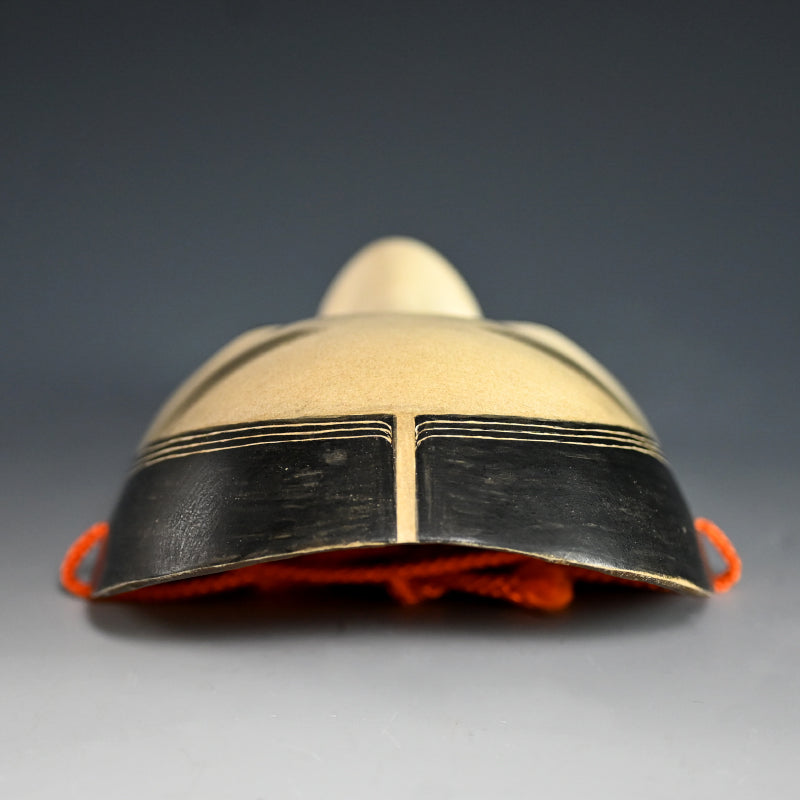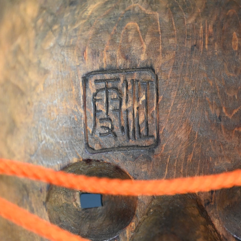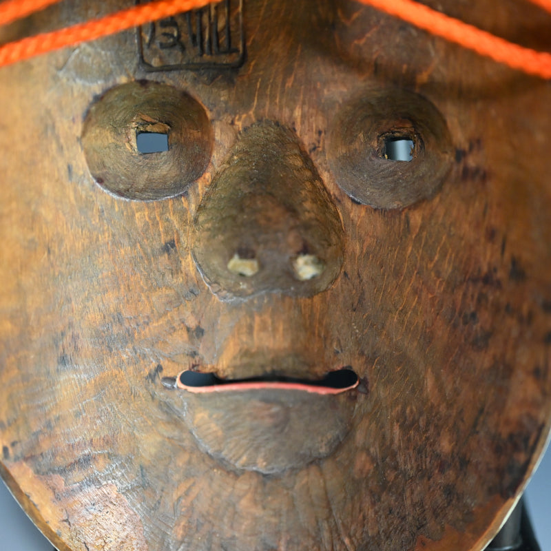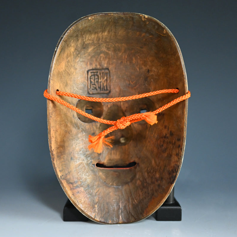 A Noh mask representing a girl in the first blush of womanhood called Koomote. The full cheeks, engaging, full-lipped smile, dimpled chin, and eyes that swerve up at the sides suggest an outgoing, engaging personality. The "caterpillar" eyebrows are painted high on a full forehead and the black hair parted in the middle has three loose strands on each side. It is 21.3 x 13.5 cm, carved wood with gofun and mineral pigments, 20th century.