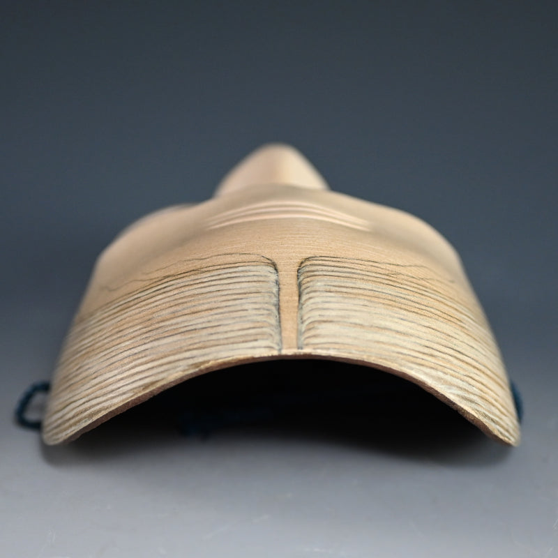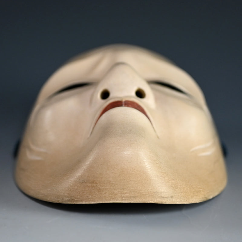 A Noh mask representing a dignified old woman. Carved wood covered with Gofun and mineral pigments, 20th century. It is 20.8 x 13.8 cm and in overall fine condition bearing the carvers seal in the back. There are many forms of this type of mask, however, all share the wrinkled and bony features of a woman grown old gracefully. The sunken eyes look down, being carved as a slightly curved slit. The serenity of the face reflects a divine nature that has only temporarily taken on the form of an old woman, such as the spirit of the old wife-goddess in Kuzu. Uba is used generally for non-dancing roles.