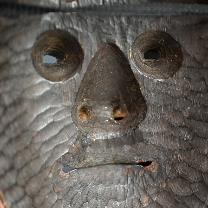 酒を飲むのが大好きな、遊び好きな精霊:猩々を木彫りした能面です。 胡粉と岩絵具で覆われた木彫り作品で、20世紀の作品です。 大きさは 20.8 x 13.5 cm で、裏面に彫刻家の印章があり、全体的に良好な状態です。