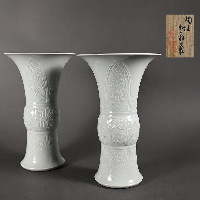 20世紀初頭に三浦竹軒 が制作した 浮き彫り模様の美しいペアの白磁花瓶です。 直径 約17.5cm / 高さ 28.5cmで 良好な状態です。