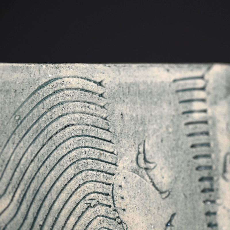 重森陽子作の立方体容器。縁が削られた平板状の側面を持ち、外側は落ち着いた淡い釉がかけられ、片面に歯型の刻印が入っています。内側は鮮やかな青と黒で彩られ、「千天文CUBE」と題された木箱に収められています。重森陽子の署名と、内側には兄の直樹の裏書があります。波間を泳ぐ黒い魚の絵が描かれた台座に署名が入っています。サイズは14 x 14 x 14.5cm(約5.5 x 5.5 x 5.3/4インチ)で、状態は良好です。重森陽子の遺品から直接譲り受けました。