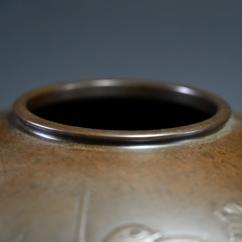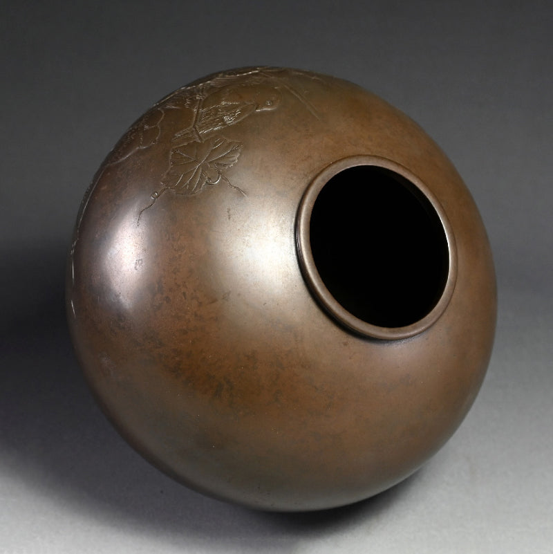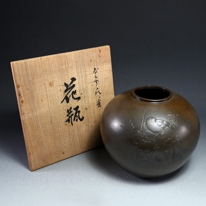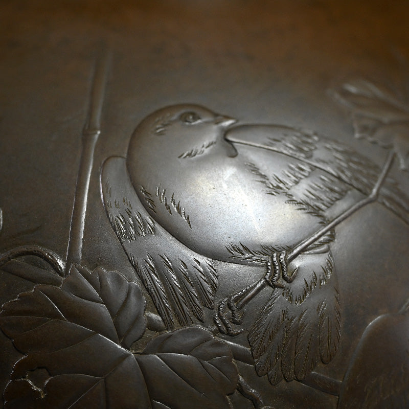内免勝二(紫峰)によるこの大きな青銅の花瓶には、竹の棒に絡みつくからす瓜の渦巻く蔓に雀が止まっています。オリジナルの署名入り木箱に入っています。直径27cm、高さ23cm、重量 4.8kgで状態は良好です。