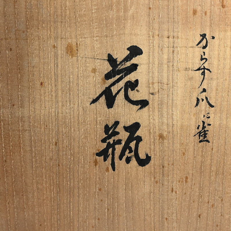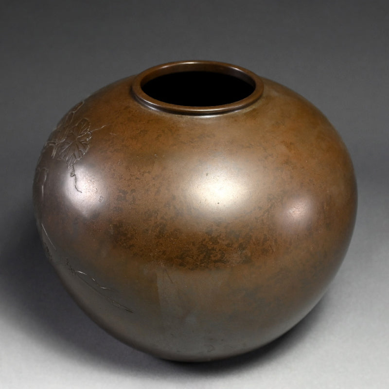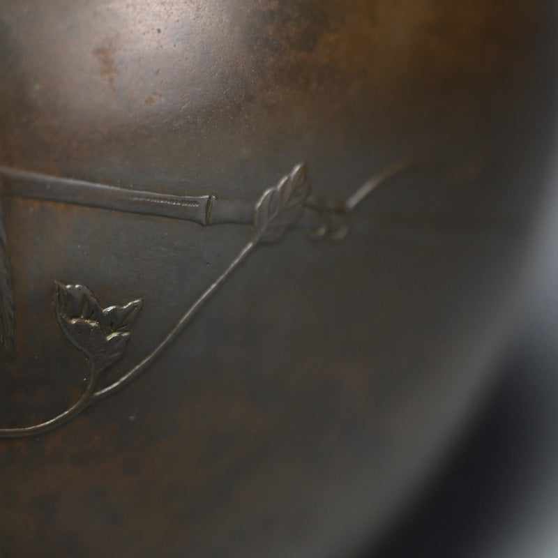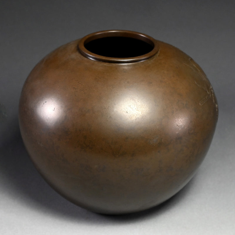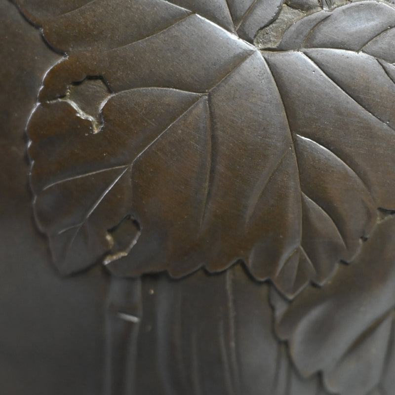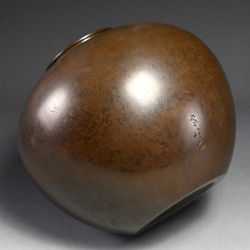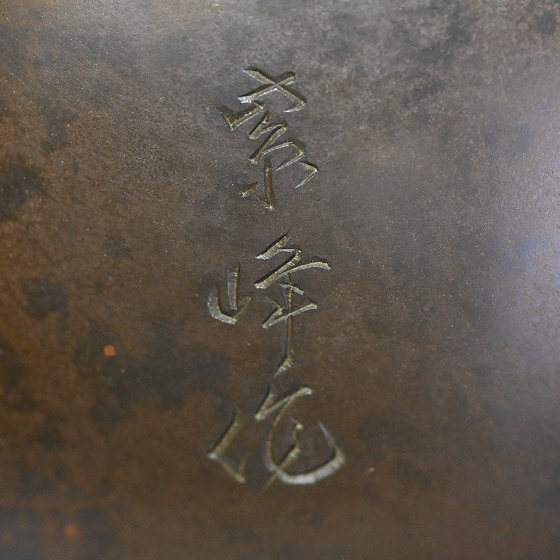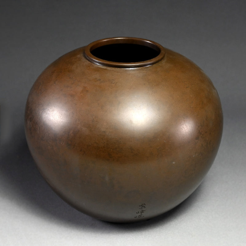 初代 内免紫峰(1904-1987)は、15歳より市岡紫雲に師事し、金工を学び、1925年に自身の工房を設立しました。彼の作品は1930年の国立尚古展で初めて公開されました。2年後、彼はベルギー万国博覧会で賞を受賞 しました。彼は1960年代半ばの混乱期にも精力的に活動を続け、1967年に高岡市から文化勲章を受章しました。高岡市立博物館には作品が所蔵されています。1987年に亡くなるまで、伝統的な青銅器の普及に尽力し、息子で2代目の紫峰は1957年から父に師事しました。彼もまた、この花瓶が1974年の高岡伝統工芸展で最優秀賞を受賞するなど、高い評価を受けています。