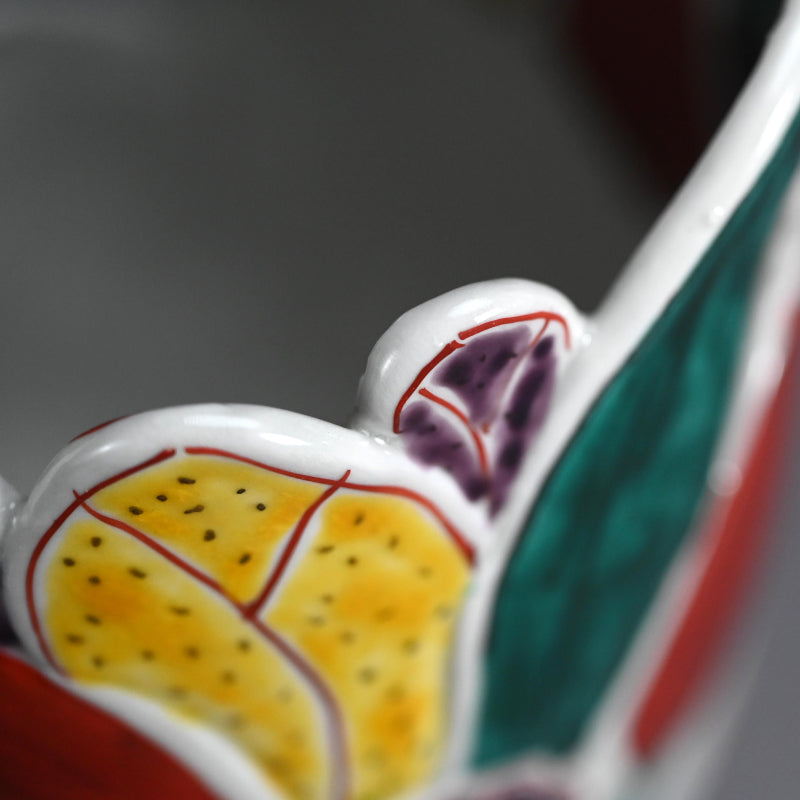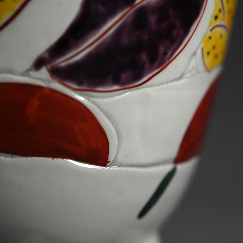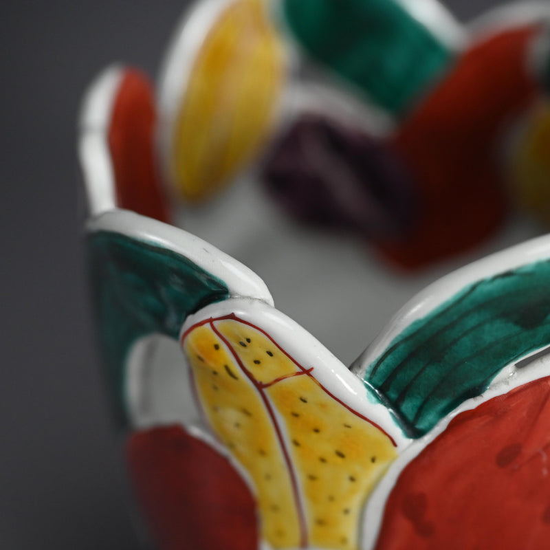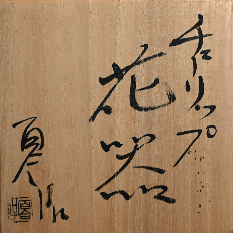 An open vessel in vivid color with playful designs by pioneering female artist Matsuda Yuriko enclosed in the original signed wooden box titled Churippu Kaki (Tulip Vase). It is 15 cm (6 inches) diameter, 21 cm (8-1/4 inches) tall and in excellent condition.