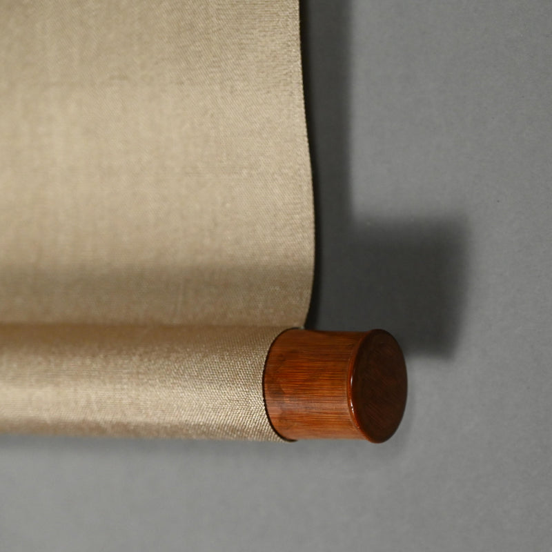 A stately ink image of a sencha Kyusu tea pot by Fukuda Kodojin signed by his Japanese Poetry name Haritsu mounted in the Chagake tea room style. Ink on silk, in a crushed paper border terminating in humble wooden rollers befitting the tea room. It is 46 x 110.5 cm (18 x 43-1/2 inches) and has been fully restored in excellent condition. It comes in a wooden box.
