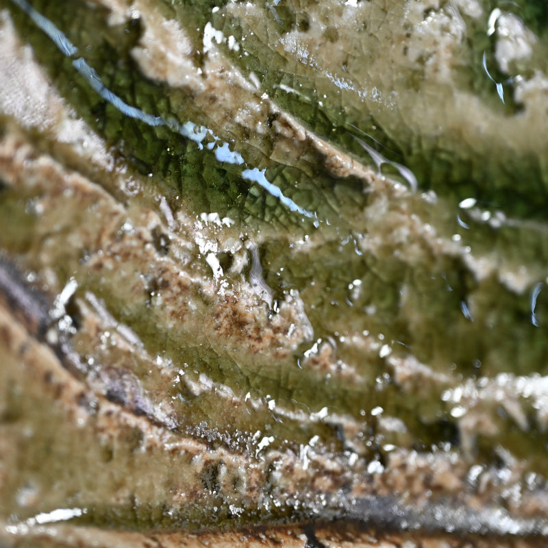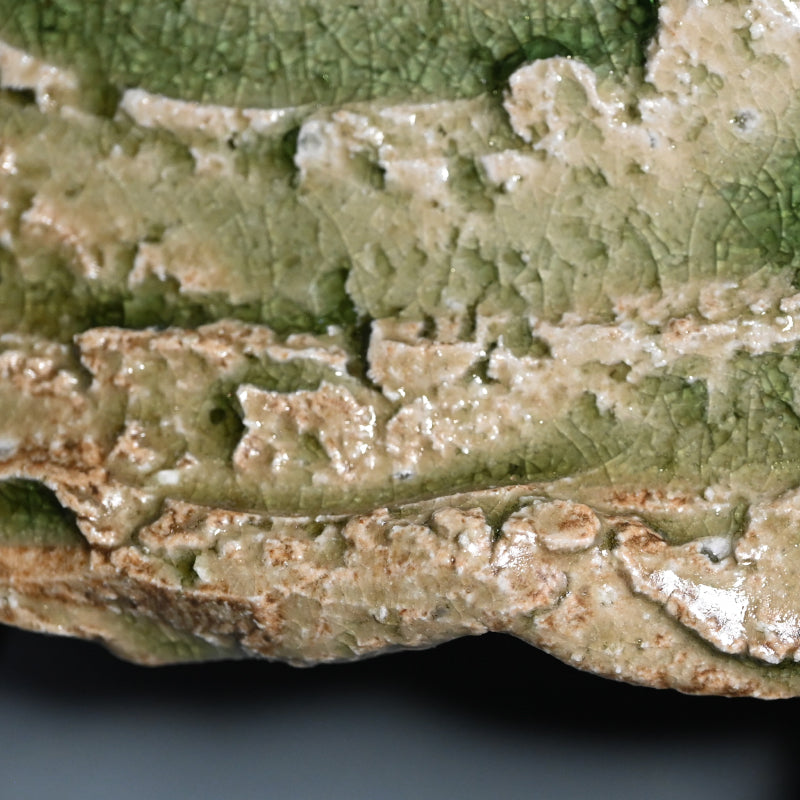 Furrows of torn earth are filled with crackled green glass creating this spectacular large dish by important contemporary artist Tanimoto Yo enclosed in the original signed wooden box titled Iga Sara. It is 37.5 cm (15 inches) diameter and in excellent condition.