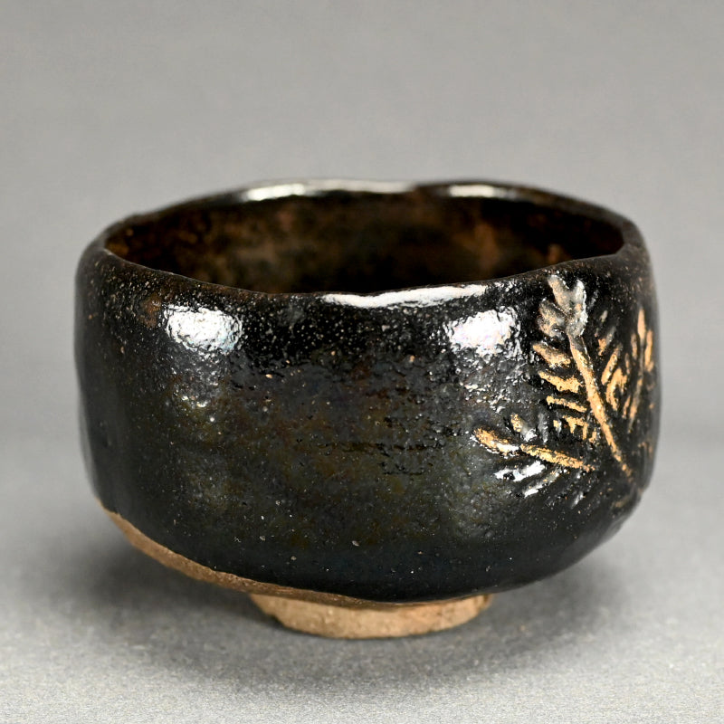 七代 長入による美しい質感の黒いお椀です。金色の松の枝が刻印され、古い木箱に入っています。台座には作者の詳細な記録が刻まれた印が押されています。直径12cm、高さ8cmで状態は良好です。