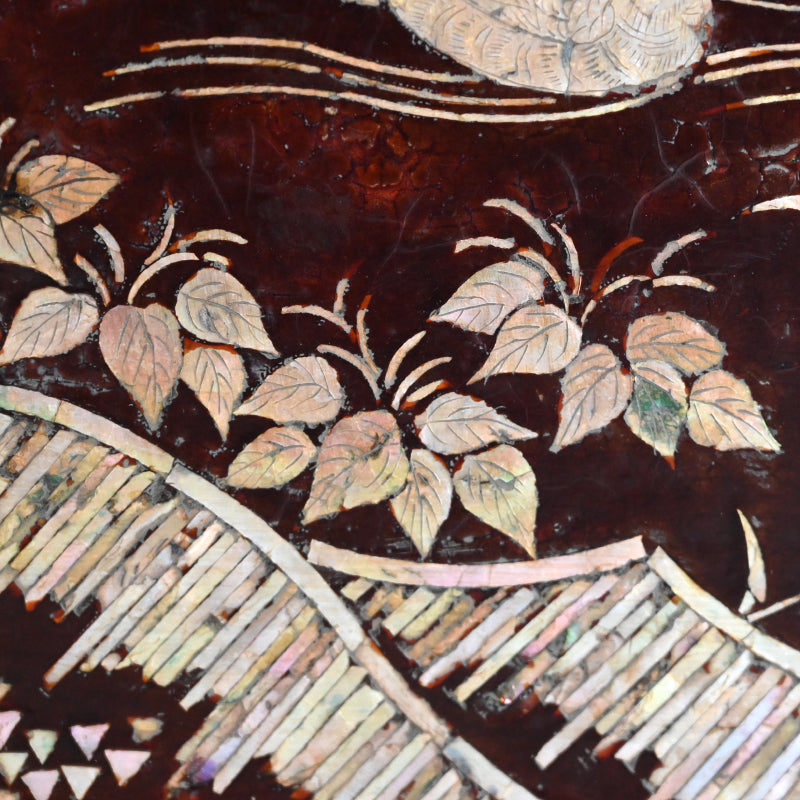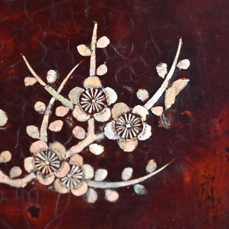 帝室技芸員の諏訪蘇山 によるこの筆箱には、螺鈿細工で険しい山々の前の楼閣の間をさまよう賢者の大陸の風景が描かれています。青磁の墨石、水指、筆、ペーパーナイフが付属し、署名入りのオリジナルの木箱に収められています。蓋の内側には 梅の花が咲く木の下でオシドリが視線を交わし、その下の雲の間を鶴が舞い上がる様子が描かれています。蓋の下部には赤い漆で署名されています。この作品は 23.5 x 27 x 5 cmで、オリジナルのパッド入りシルク布で包まれており非常に良好な状態です。
