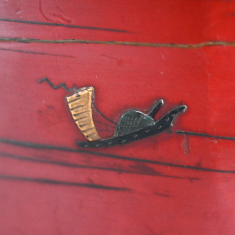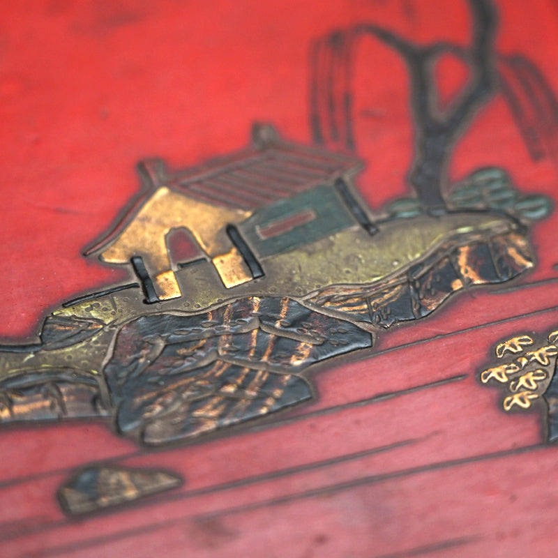 朱漆塗りの渦巻き脚 3 本の大きな容器で、穏やかな水面を帆船が行き来する岸辺の沖合に点在するパビリオンが飾られています。直径 30 cm、高さ 31 cmで、全体的に良好な状態です。琉球漆によく見られる独特の赤色は、中国や日本のものよりも鮮やかな色調です。生漆と赤色の顔料をほぼ同量混ぜて作られ、日光を浴びると血のように赤くなります。この作品は、琉球漆特有の「重ね錦」という技法を用いています。漆と顔料を混ぜて粘土のようなものを作り、それを形作り、彫り、対象物に塗り付けることで 立体的な質感を生み出します。