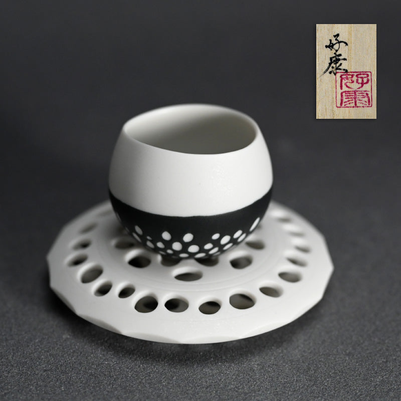 An elegant egg-like sake cup on a dimpled Zabuton pillow of raw pierced porcelain clay by the stylish Kato Yoshiyasu enclosed in the original signed wooden box titled To-mon Hai Ozabu. The cup is 5 cm (2 inches) diameter, the pillow is 8.6 cm (3-1/2 inches) diameter and both are in perfect condition, directly from the artist.