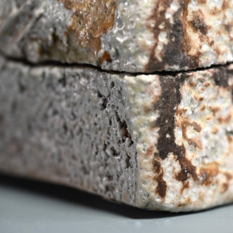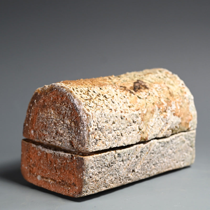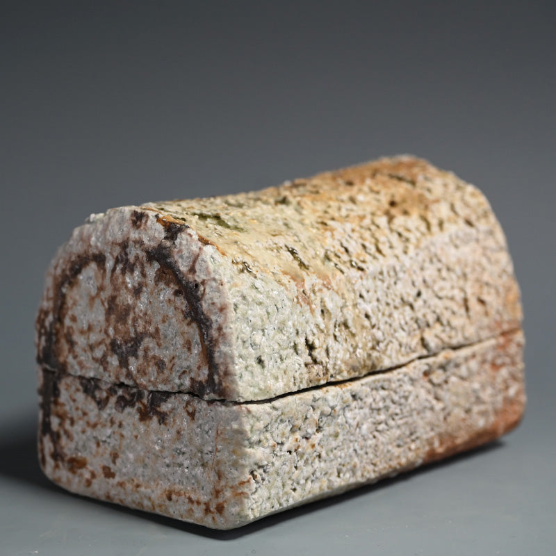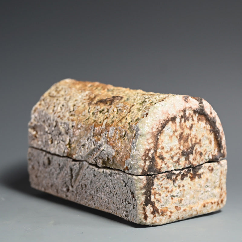 伝説的な薪焼きの名匠、古谷道夫氏による、研磨された土に厚い天然灰釉を施したドーム型の陶器箱。オリジナルの署名入り木箱に収められています。サイズは17.5 x 11 x 12 cm(7 x 4.5 x 5インチ)で、状態は良好です。