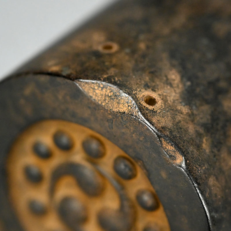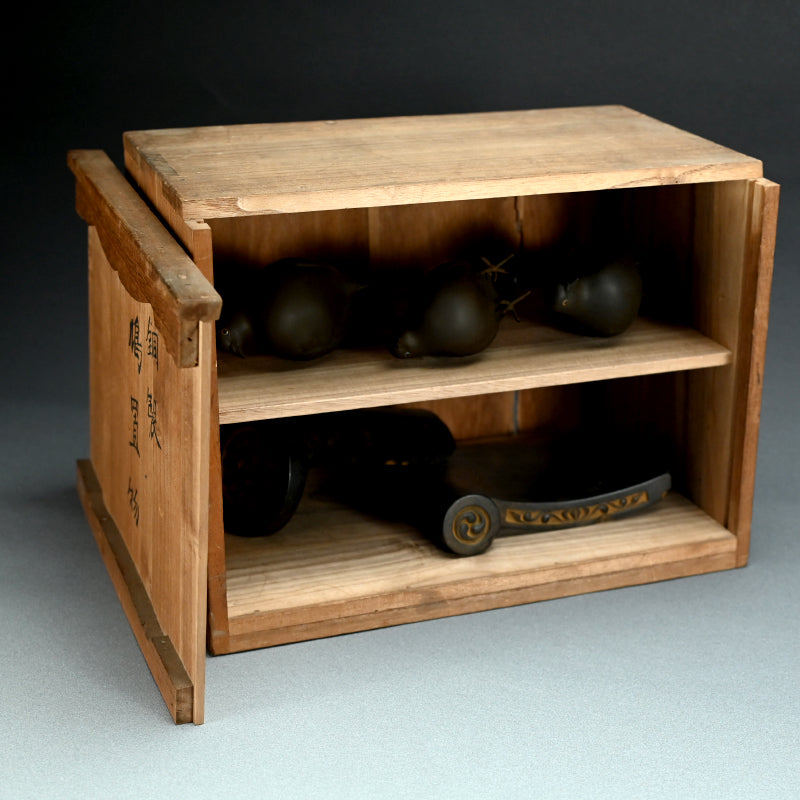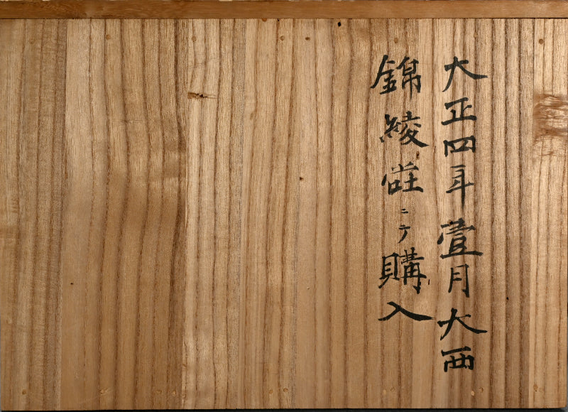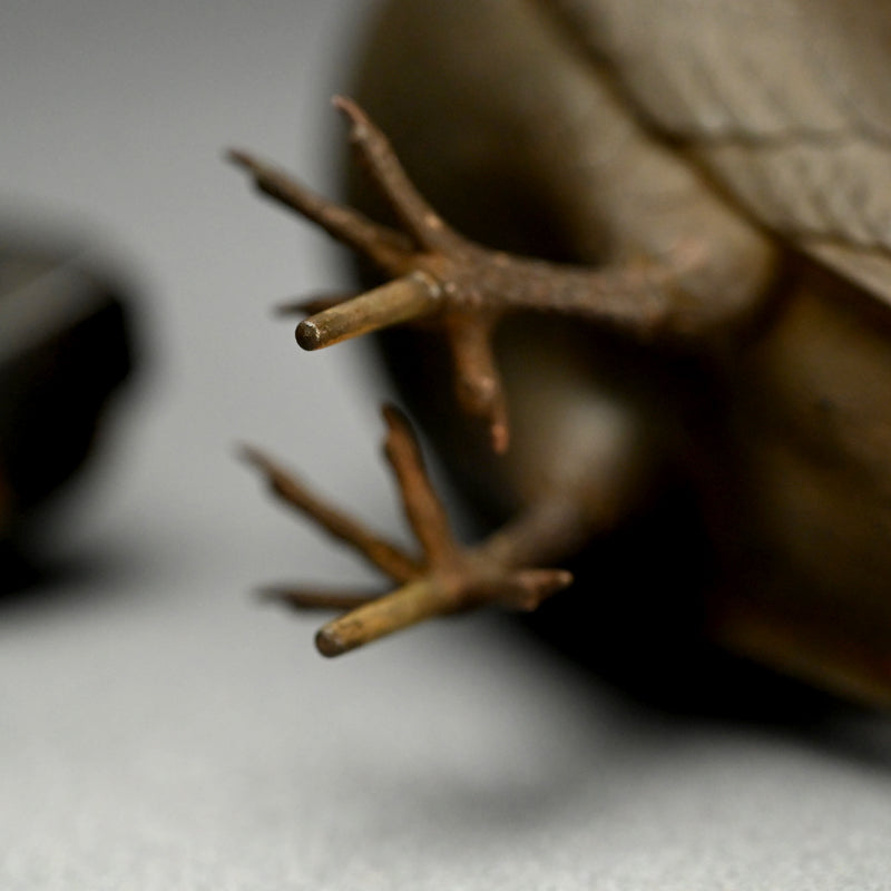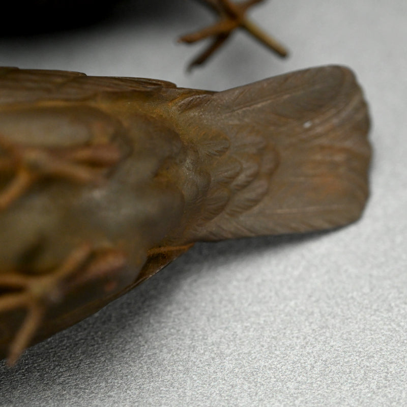 銀色の羽と金色の目の斑点がついたこの見事なブロンズ製の鳥 3 羽のセットは、落ちた屋根瓦の形をしたブロンズ製の台座にセットされています。"一双" の署名があり、大正 4 年 (1915 年) のオリジナルの木箱に収められています。組み立てるとになり、状態は良好です。