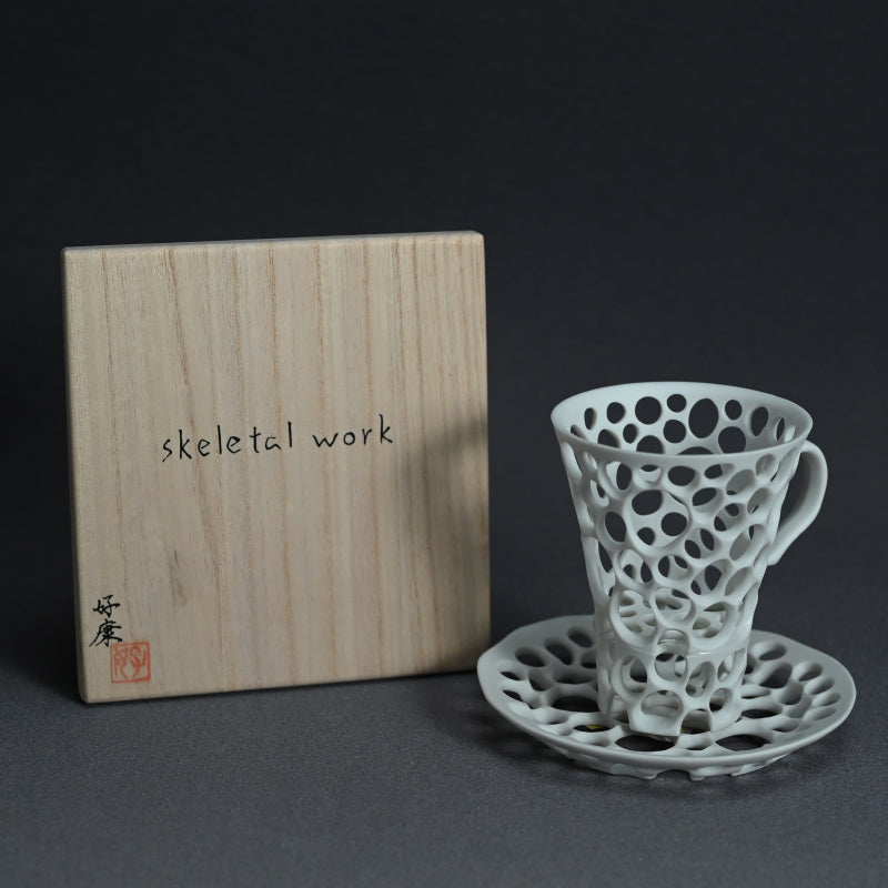 Only the skeleton remains of this cup and saucer by Kato Yoshiyasu enclosd in the original signed wooden box. This piece is truly reminiscent of the pod of the Japanese lantern flower, after the flower has deteriorated, leaving behind a framework of such delicate frailty. It is 11.5 x 10.5 x 9.8 cm (4-1/2 x 4-1/4 x 4 inches) and in excellent condition, directly from the artist this year.
