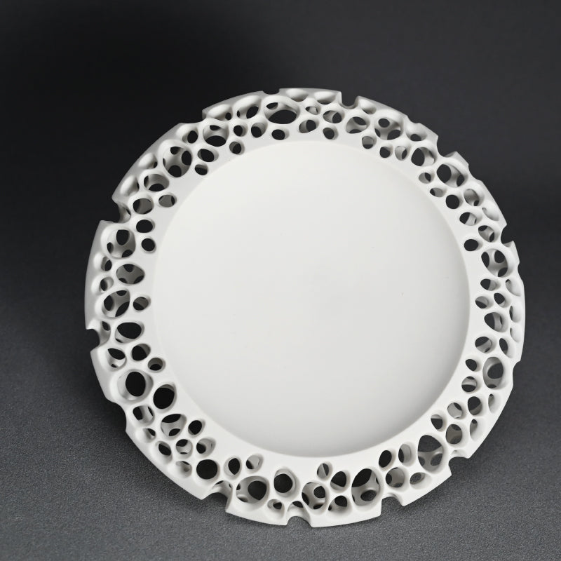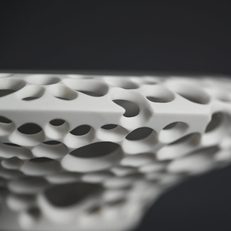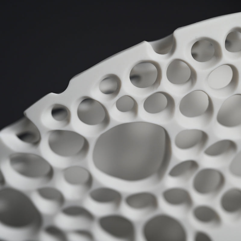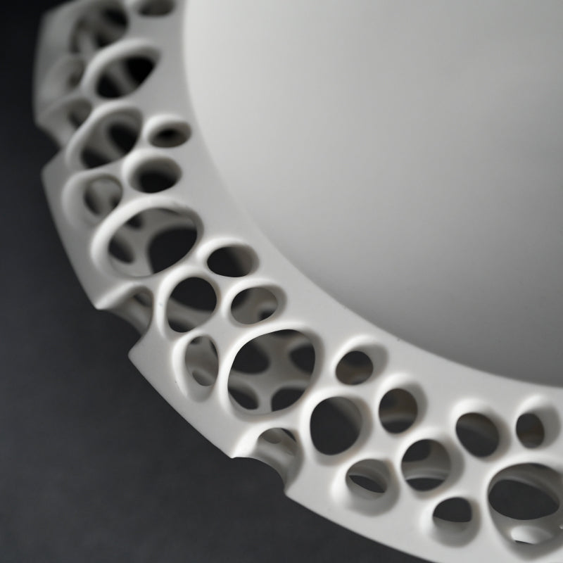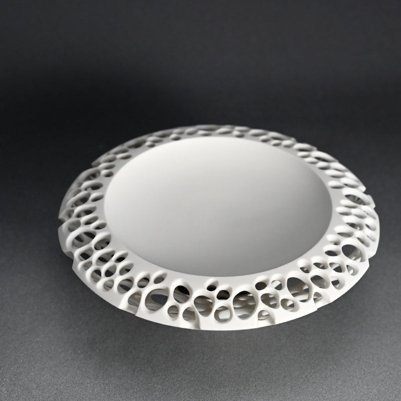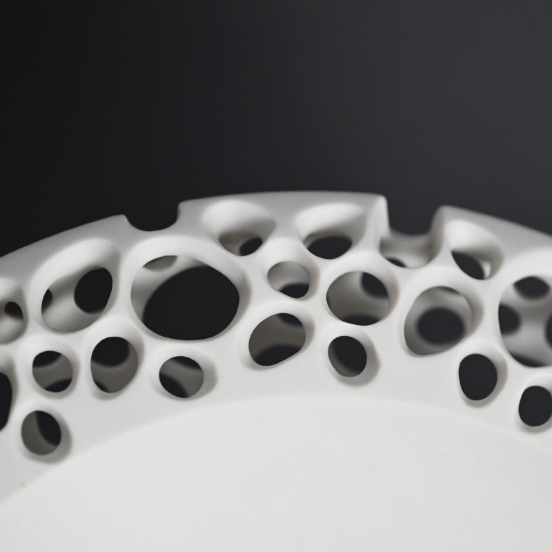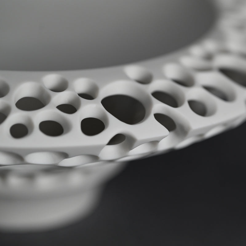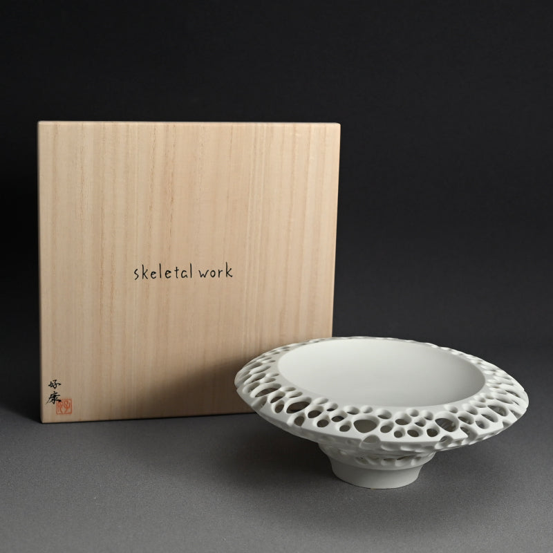 An elevated plate with a smooth basin cut from sheer white porcelain pierced around the sharp ege with holes leaving a skeletal form by Kato Yoshiyasu enclosed in the original signed wooden box titled Skeletal Work Plate. It is 21 cm diameter, 7.8 cm (3 inches) tall and in excellent condition, directly f the artist.