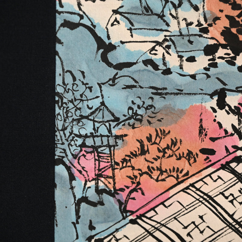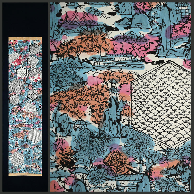 重森容子による鮮やかな色彩の劇画。険しい岩山に点在する楼閣、橋が架かる深い峡谷、舞い上がる鳥、そして曲がりくねった木々に無数の人物が描かれています。これは、彼女の遺品から譲り受け、巻物として制作した数点の墨彩画のうちの1点です。紙に青墨で彩色され、布縁に陶器のローラーで縁取られています。巻物は46.3cm×196cmで、状態は良好です。