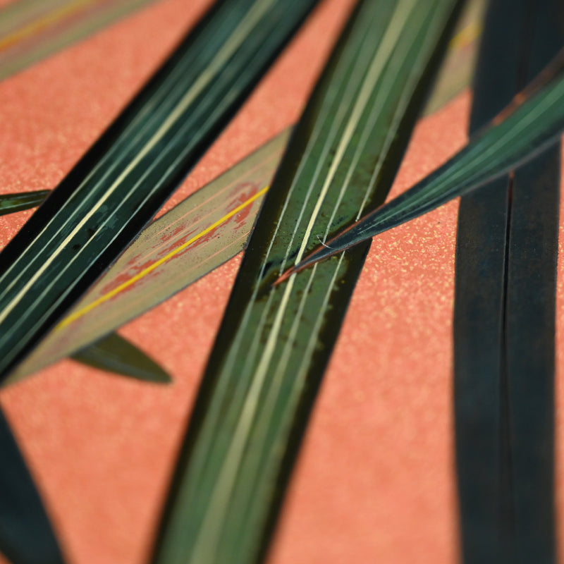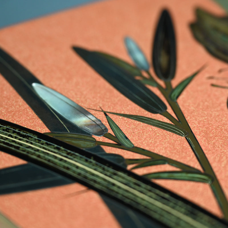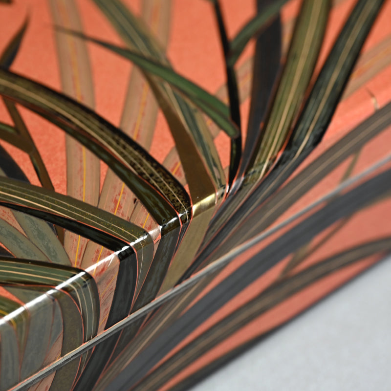 番浦省吾によるピンク地に蘭の花が描かれた印象的な大きな漆器です。「亀甲型手箱」と題されたオリジナルの銘木箱に収められていて、内側はシンプルな磨き黒漆です。外側の背景は銀を混ぜた乾漆の粉です。その上は さまざまな色の漆の葉と螺鈿の花が象嵌されています。サイズは 28 x 46 x 11 cmで、状態は良好です。