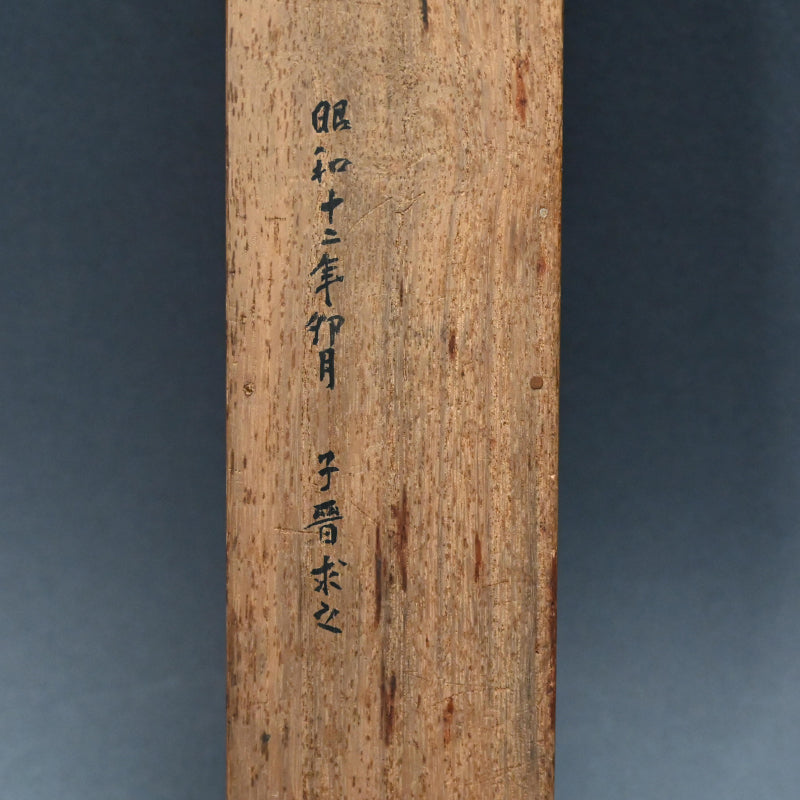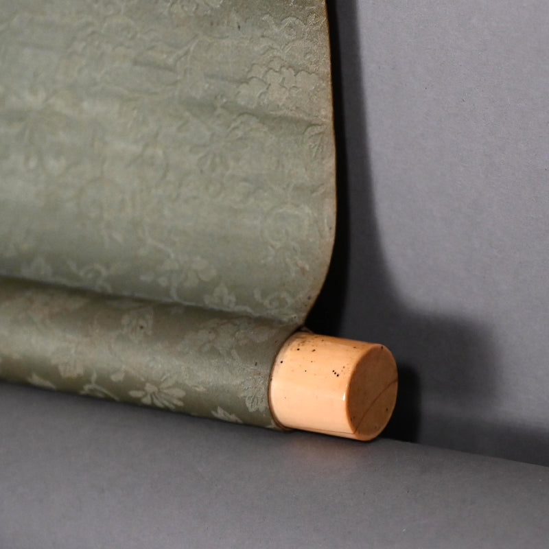 菊池桂月による1922年の詩文が添えられた、劇的な墨絵で描かれた思索石。当時の木箱に収められています。墨は紙に描かれ、象牙のローラーで装飾された絹本に収められています。サイズは43 x 217 cm(17 x 85.5インチ)で、全体的に良好な状態です。紙の変色は経年変化と露出によるものです。
